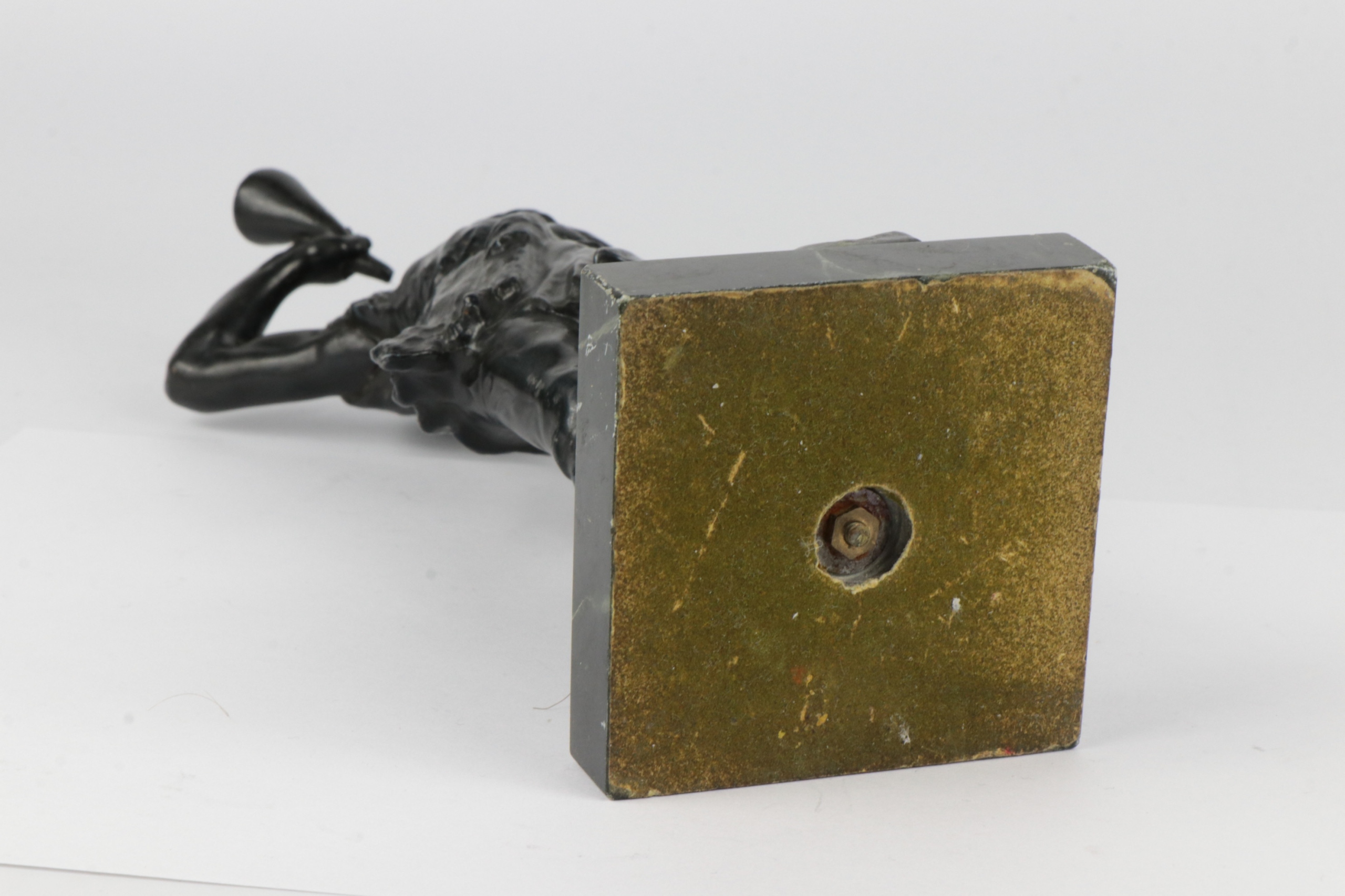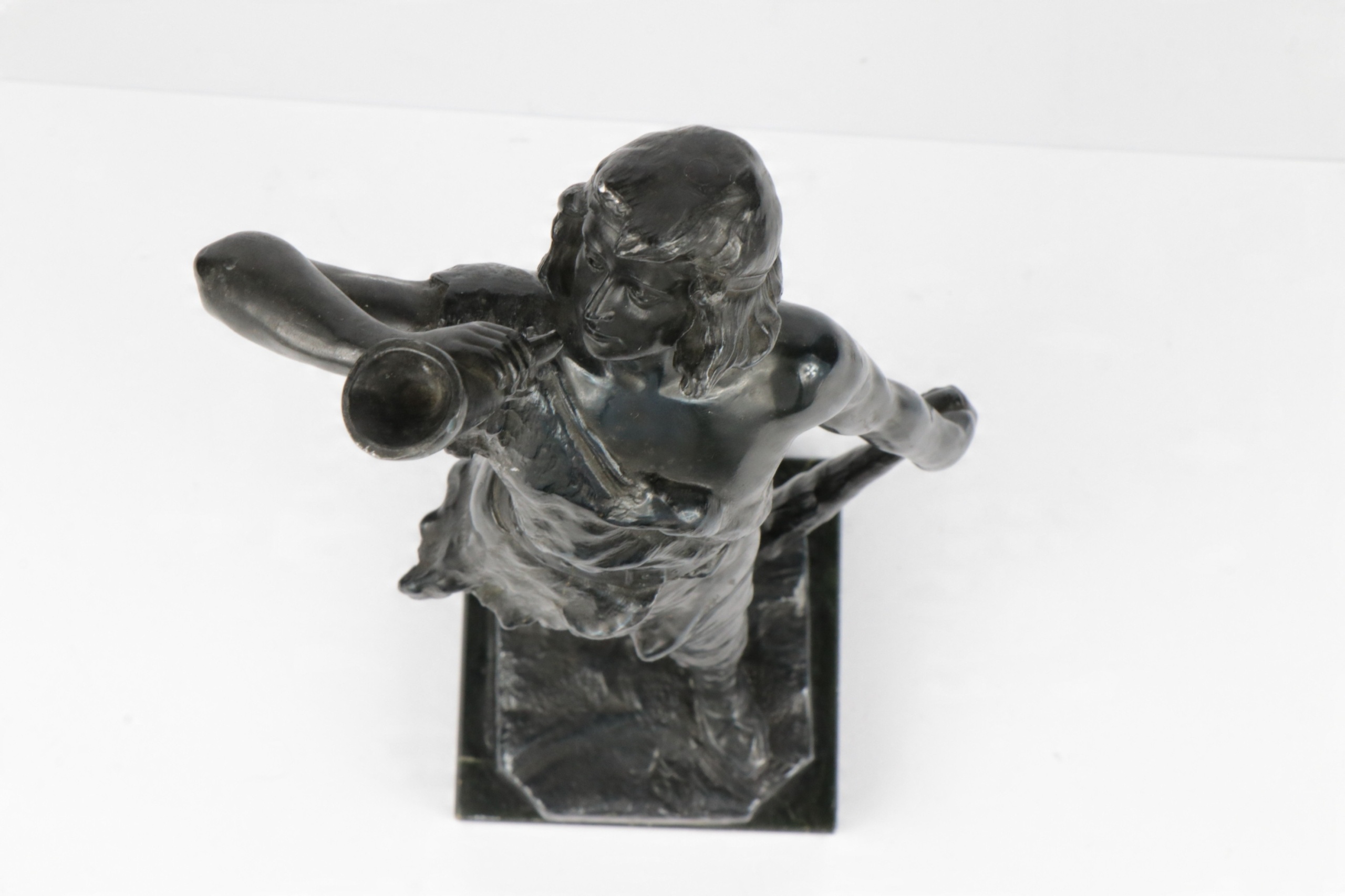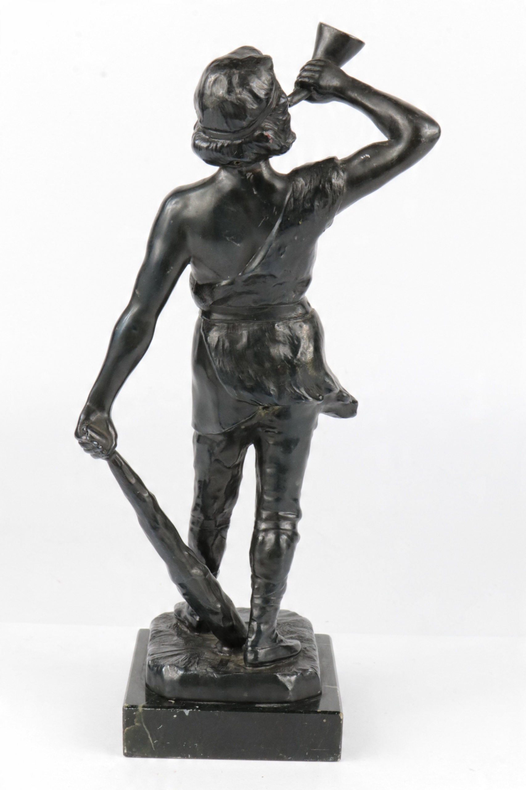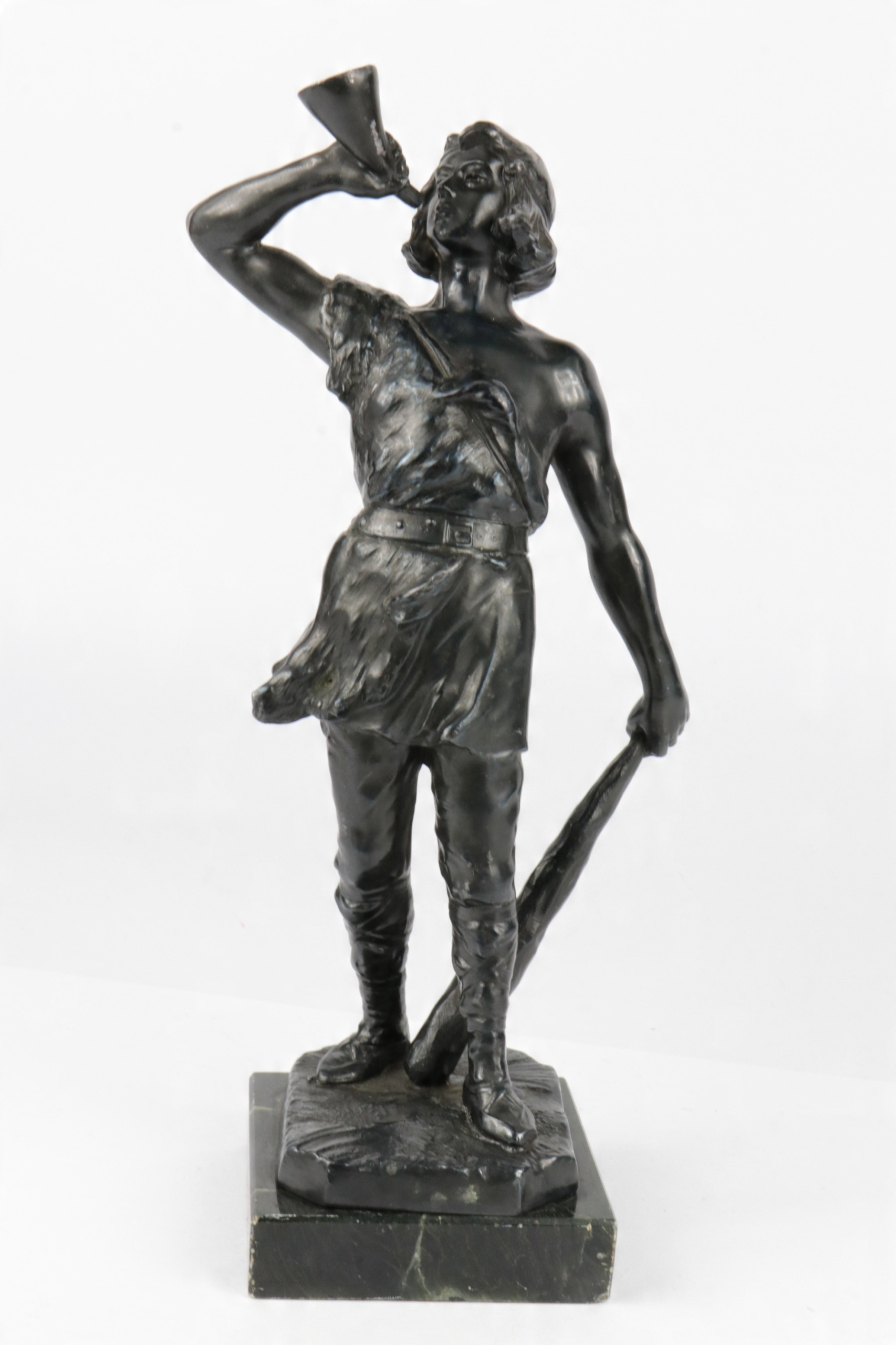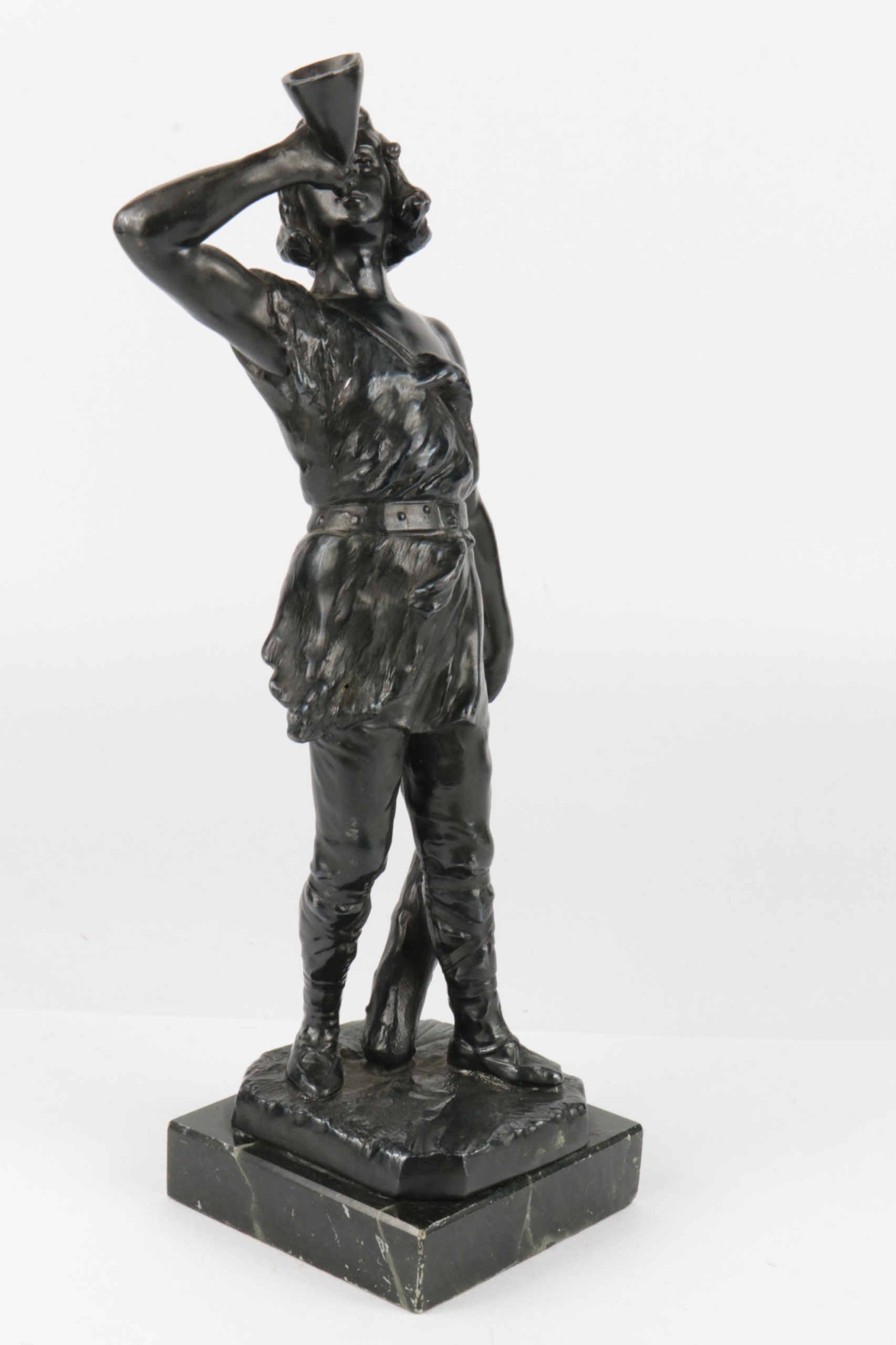 Интересная фигурка воина из Галлии или Германии, держащего в одной руке огромную дубину, а в другой - рог. Статуэтка из оловянного сплава с очень темной патиной.