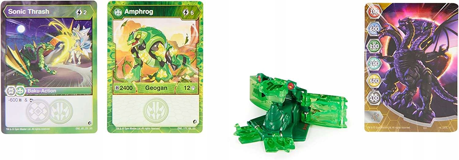 На фигурке Бакугана Геогана Амфрога изображена зеленая фигурка, похожая на лягушку, высотой примерно 6 см.