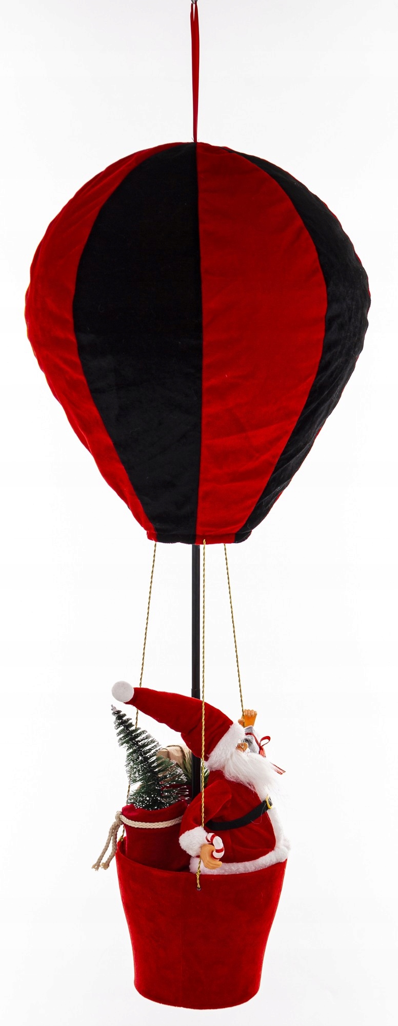 На украшении изображен Дед Мороз, летящий на красно-черном воздушном шаре - символе радости и волшебства Рождества. Сочетание классических цветов и изысканных деталей придают всей вещи элегантный и сказочный характер.