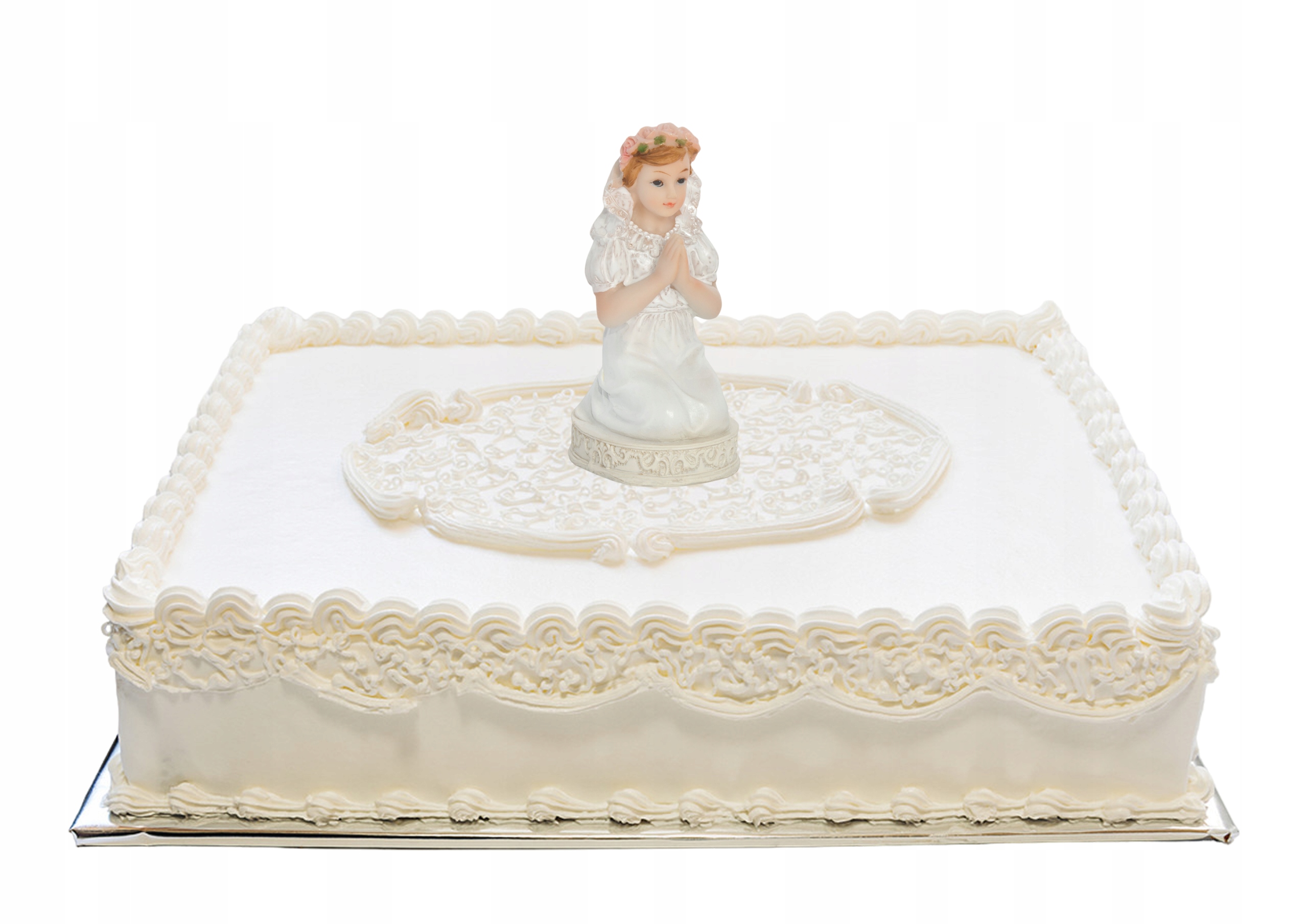 Украшение торта «Причастие» фигуркой девушки. Фигурка имеет широкую и устойчивую основу, благодаря чему ее можно легко разместить на торте. Статуэтка также идеальна в качестве украшения стола Первого причастия.