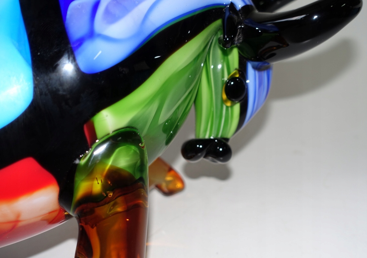 Статуэтка демонстрирует красоту такого чудесного животного, как бык; отлично сделано. Пожалуйста, обратите особое внимание на точность его изготовления (выполнено в итальянском стиле Мурано), а также на уникальные цвета и узоры внутри экспоната.