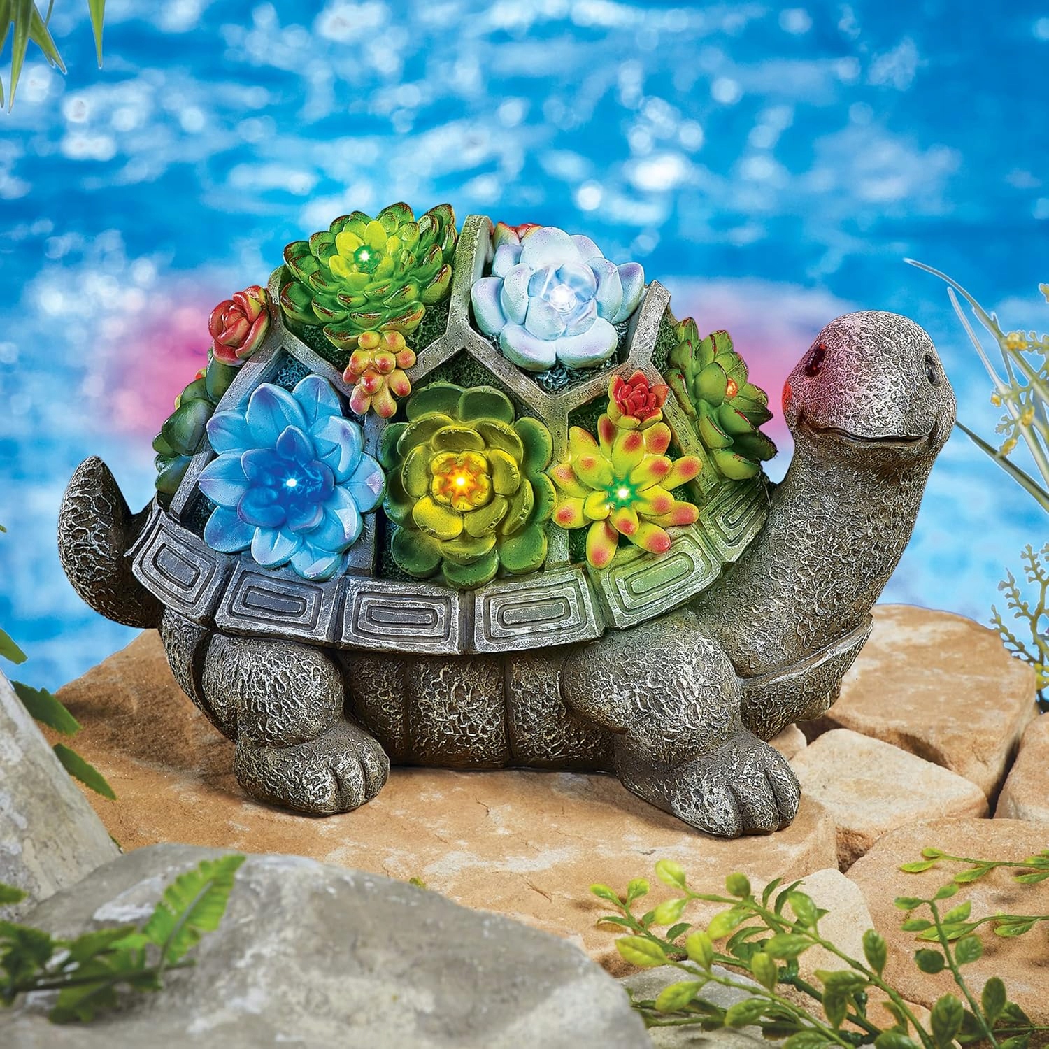 Добавьте очарование в ваш сад благодаря светодиоду солнечной черепахи , который сочетает в себе функциональность и декоративный характер. Эта ручная статуэтка с разноцветными суккулентами на броне является уникальным декоративным элементом, который будет работать как в саду, так и на террасе, балконе или подошесинге