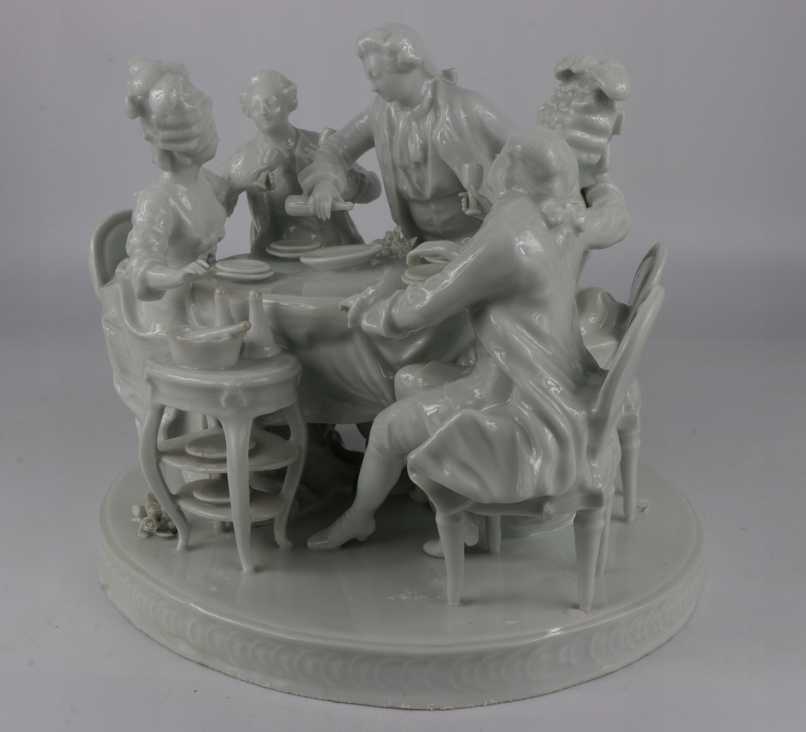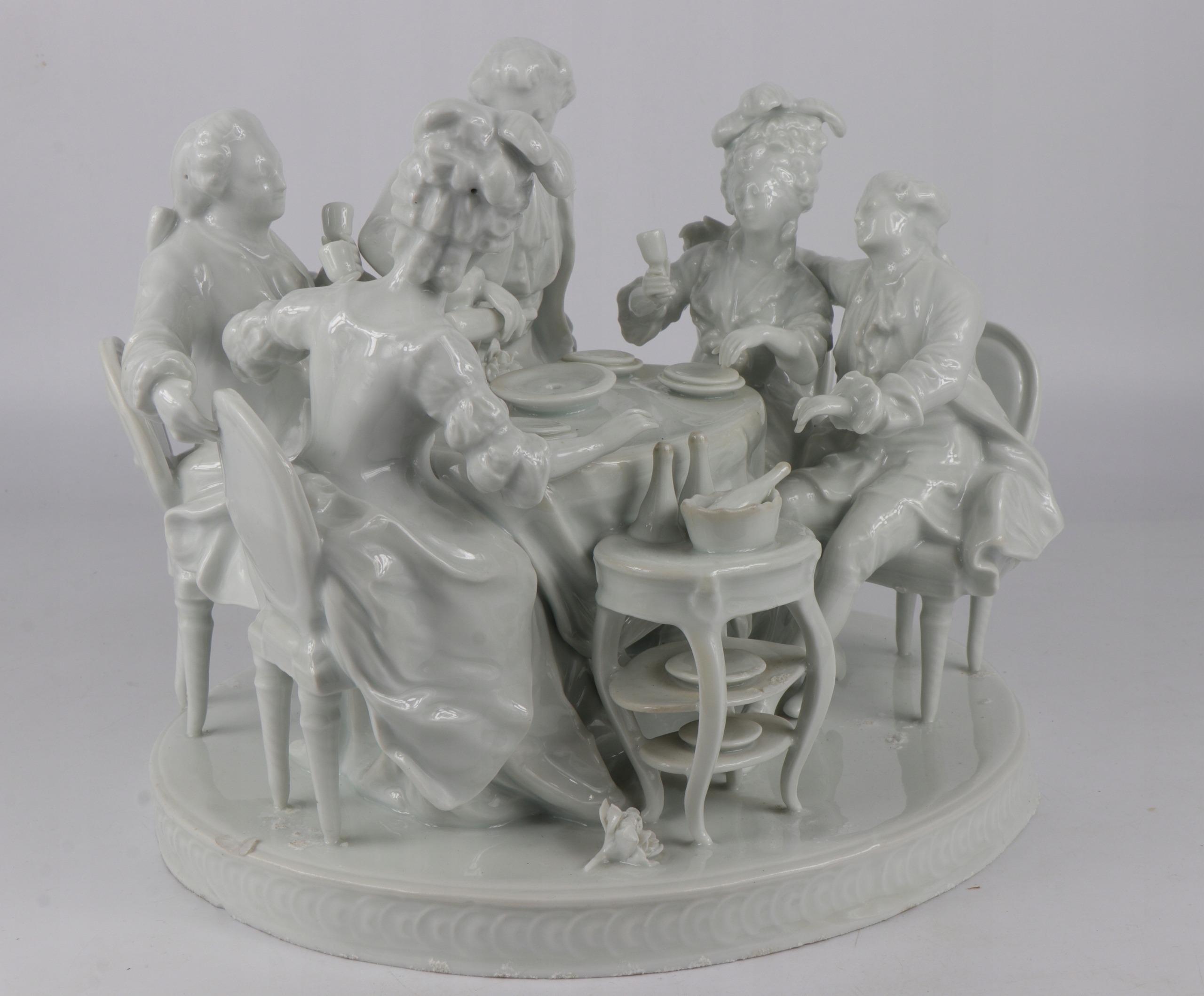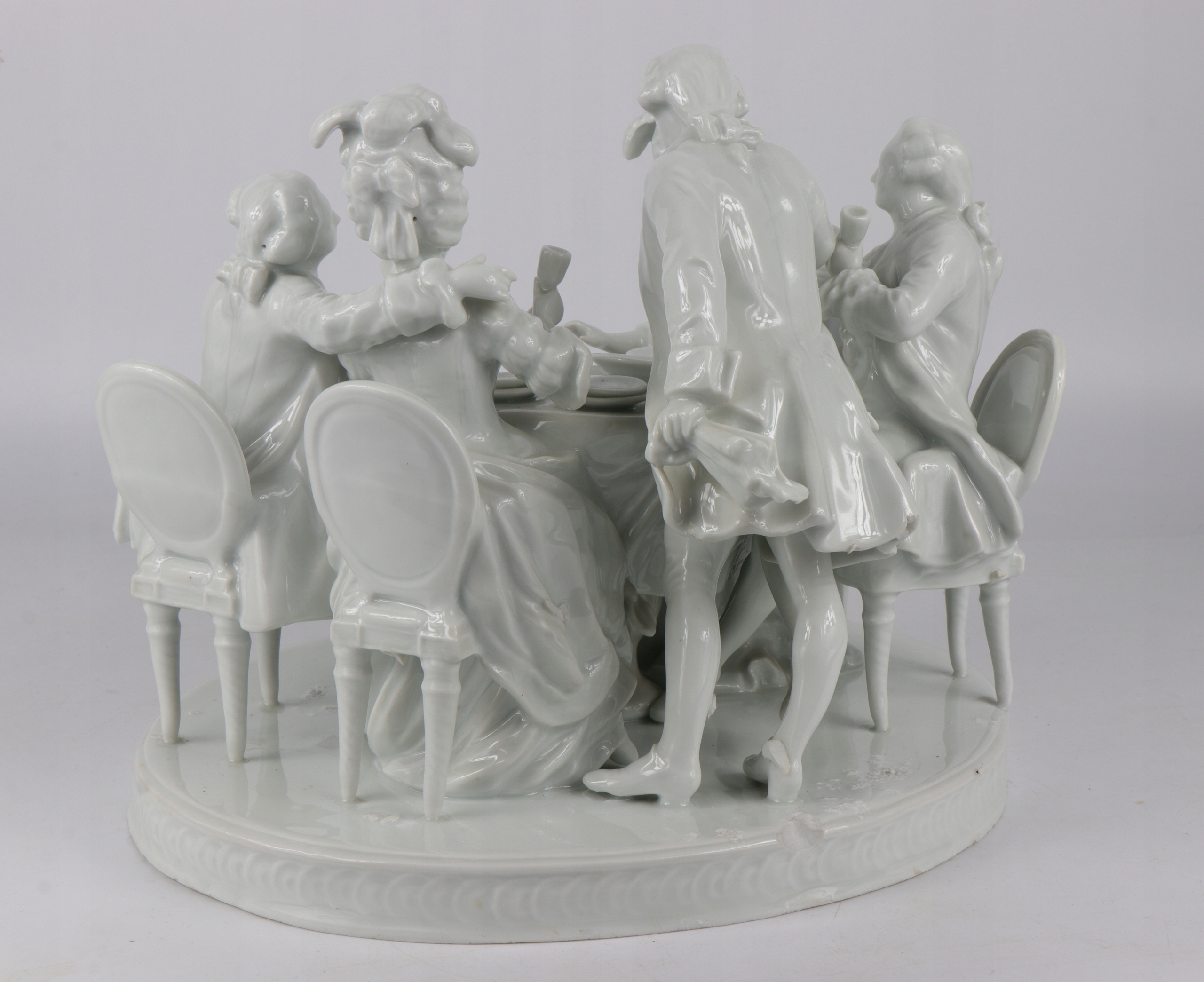Очень интересная большая фигуральная группа в стиле рококо, изображающая группу людей в костюмах восемнадцатого века. Красивая композиция за банкетным столом, четыре персонажа, сидящие на стульях Ludwików и один стоящий характер. Фарфор не подписан слегка сливочный цвет. Красивое украшение любого интерьера.