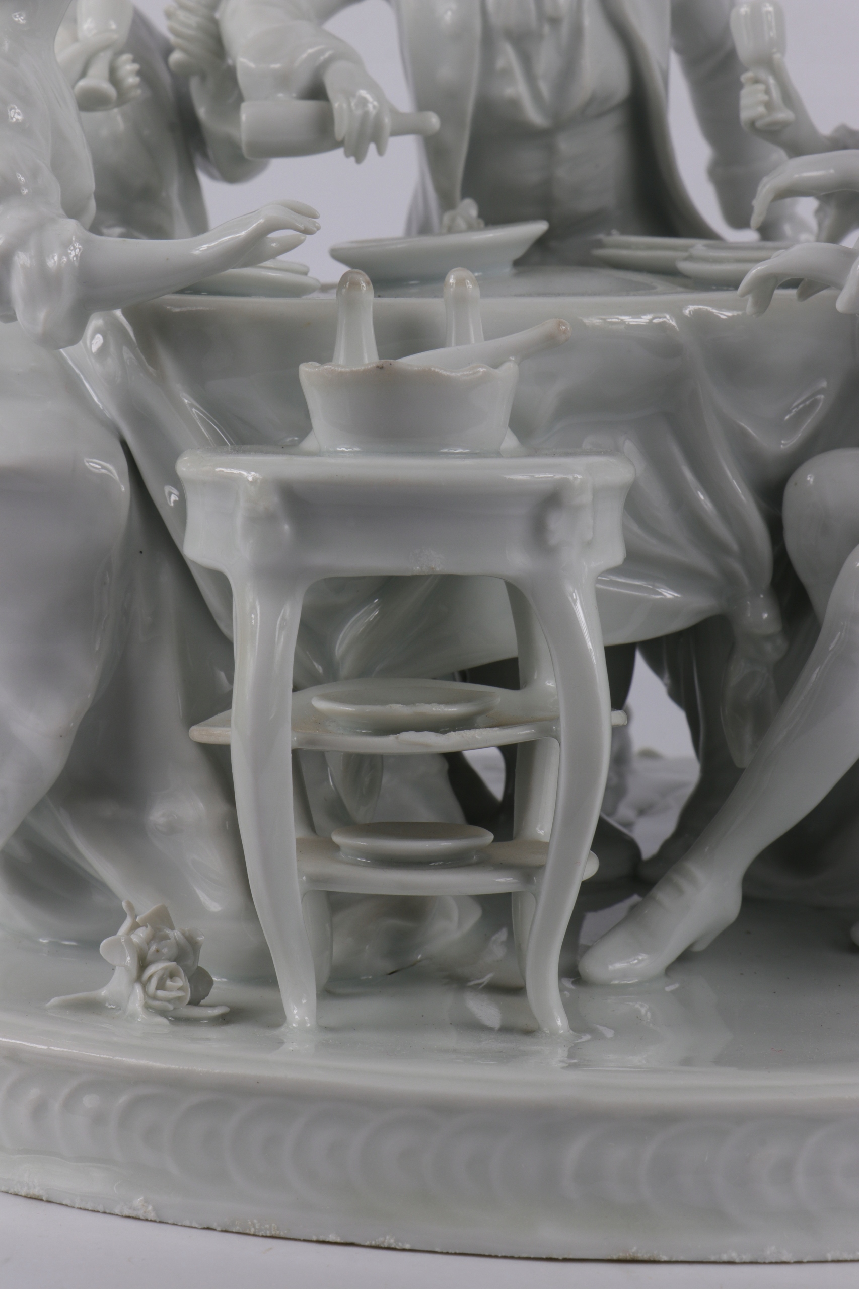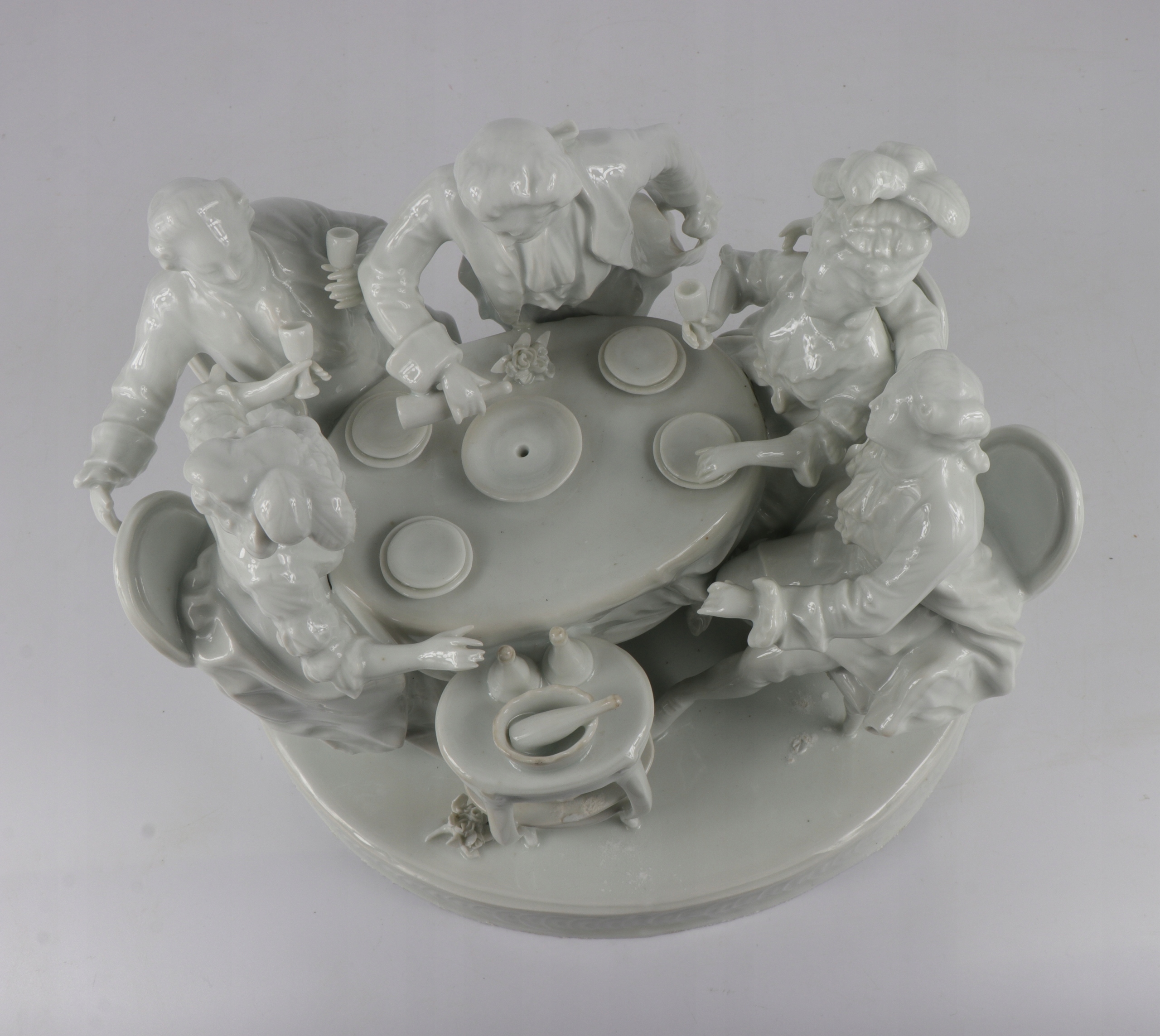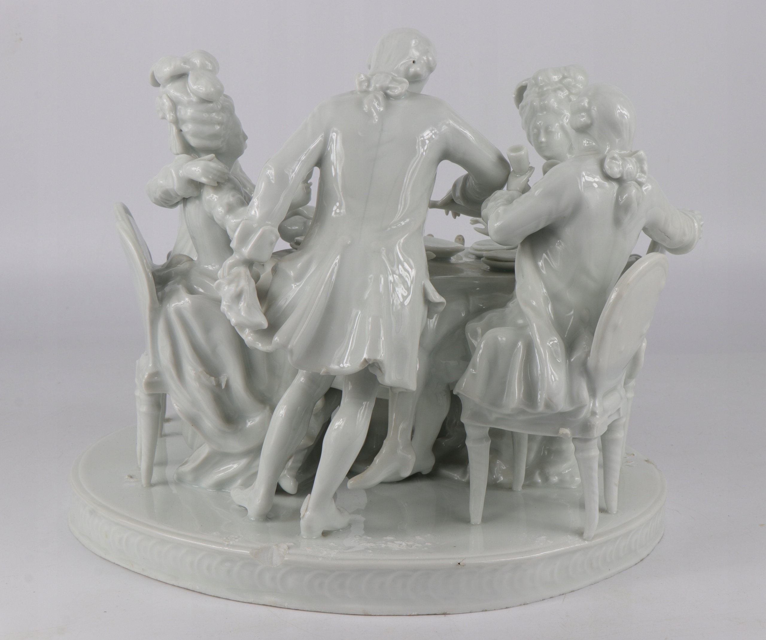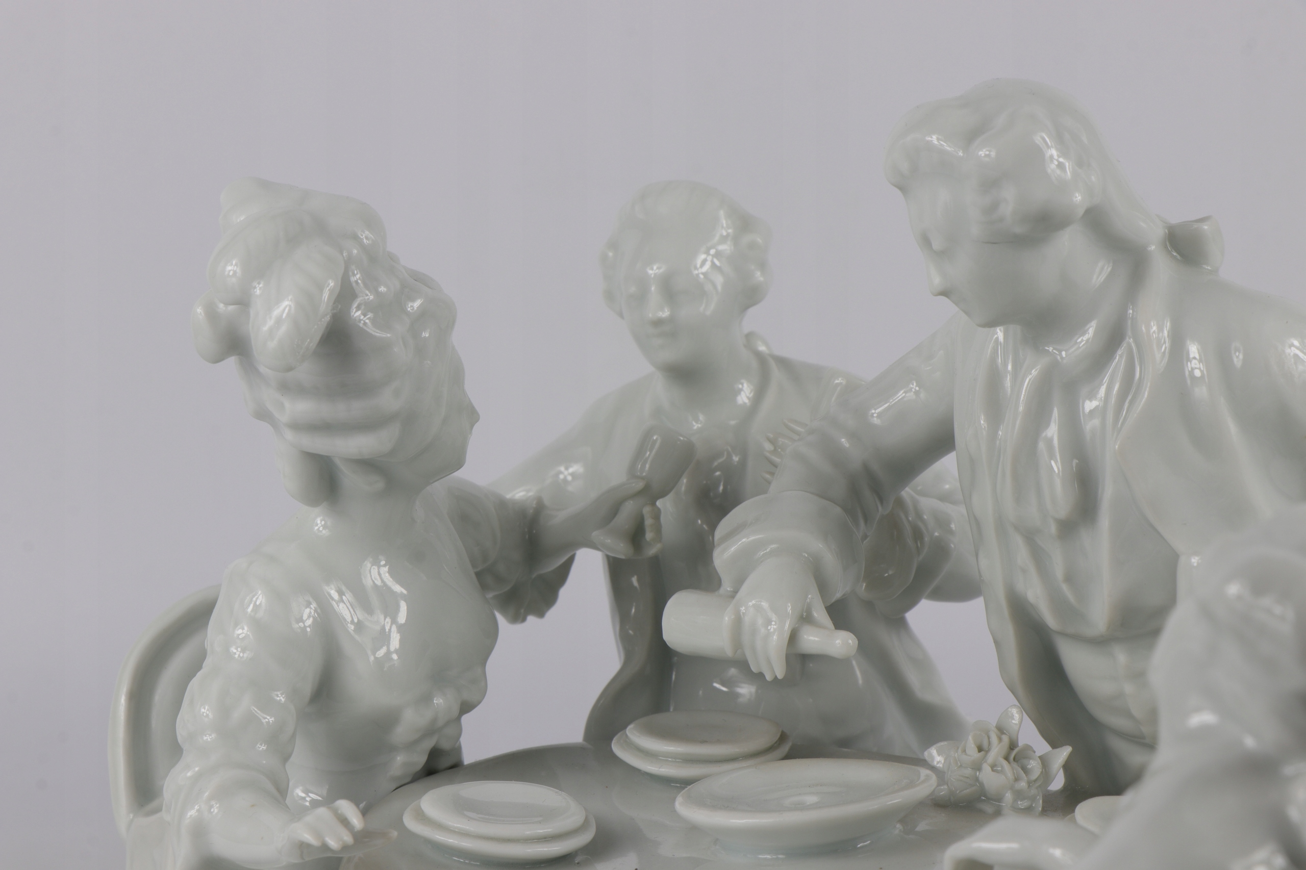 Очень интересная большая фигуральная группа в стиле рококо, изображающая группу людей в костюмах восемнадцатого века. Красивая композиция за банкетным столом, четыре персонажа, сидящие на стульях Ludwików и один стоящий характер. Фарфор не подписан слегка сливочный цвет. Красивое украшение любого интерьера.