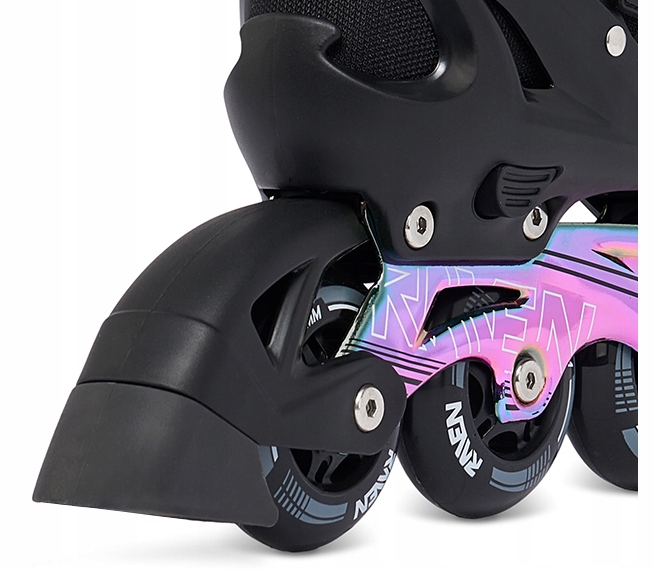 Шнурки, пряжка с зубчатым ремешком, застежка и дополнительная прижимная пряжка на язычке обеспечивают правильное затягивание и надежное удержание ноги в обуви, предотвращают смещение стопы и гарантируют безопасное вождение. Защелки роликовых коньков RAVEN имеют кнопку, которая предотвращает их расстегивание во время катания. Ремешок на липучке удерживает шнурки на месте, предотвращая их случайное развязывание.