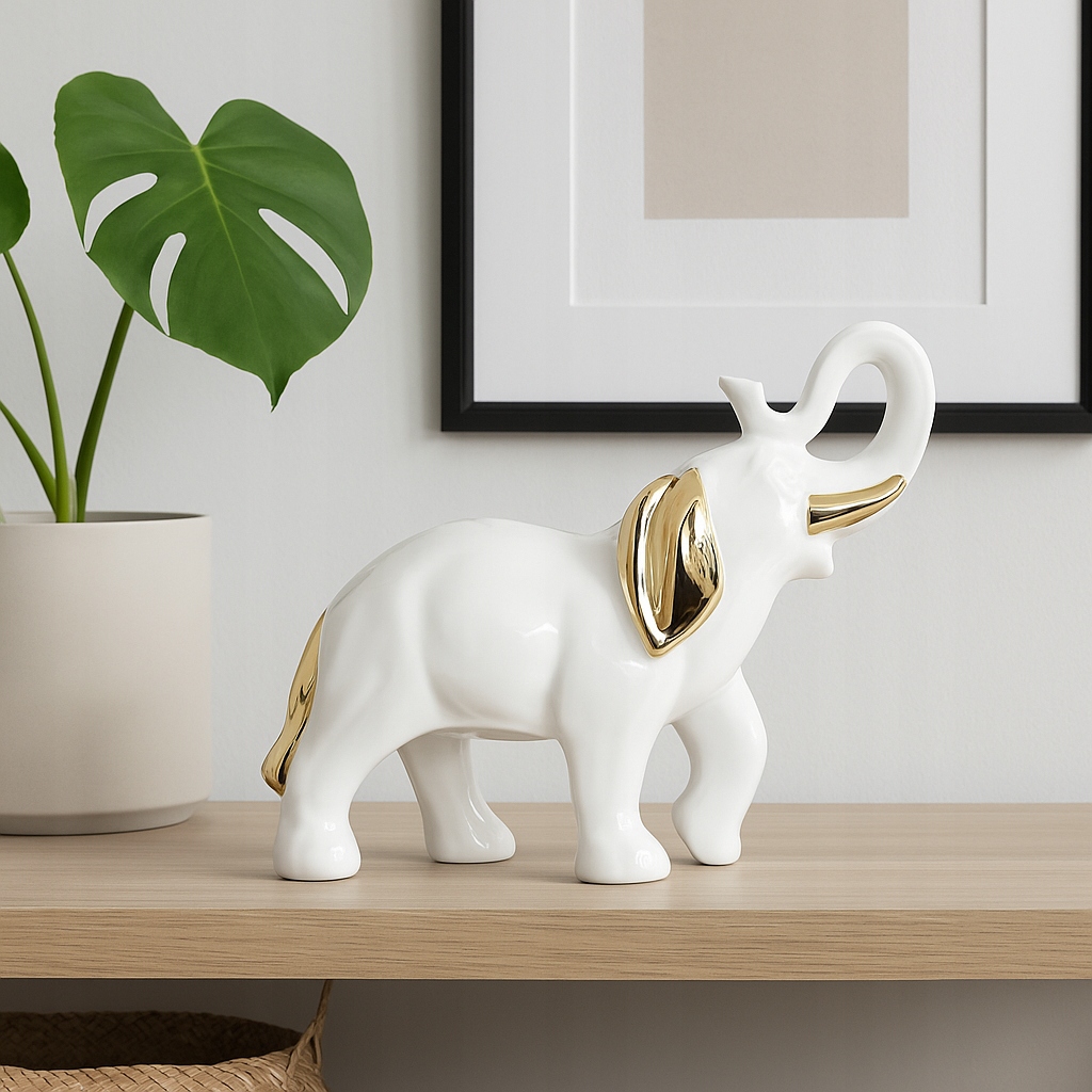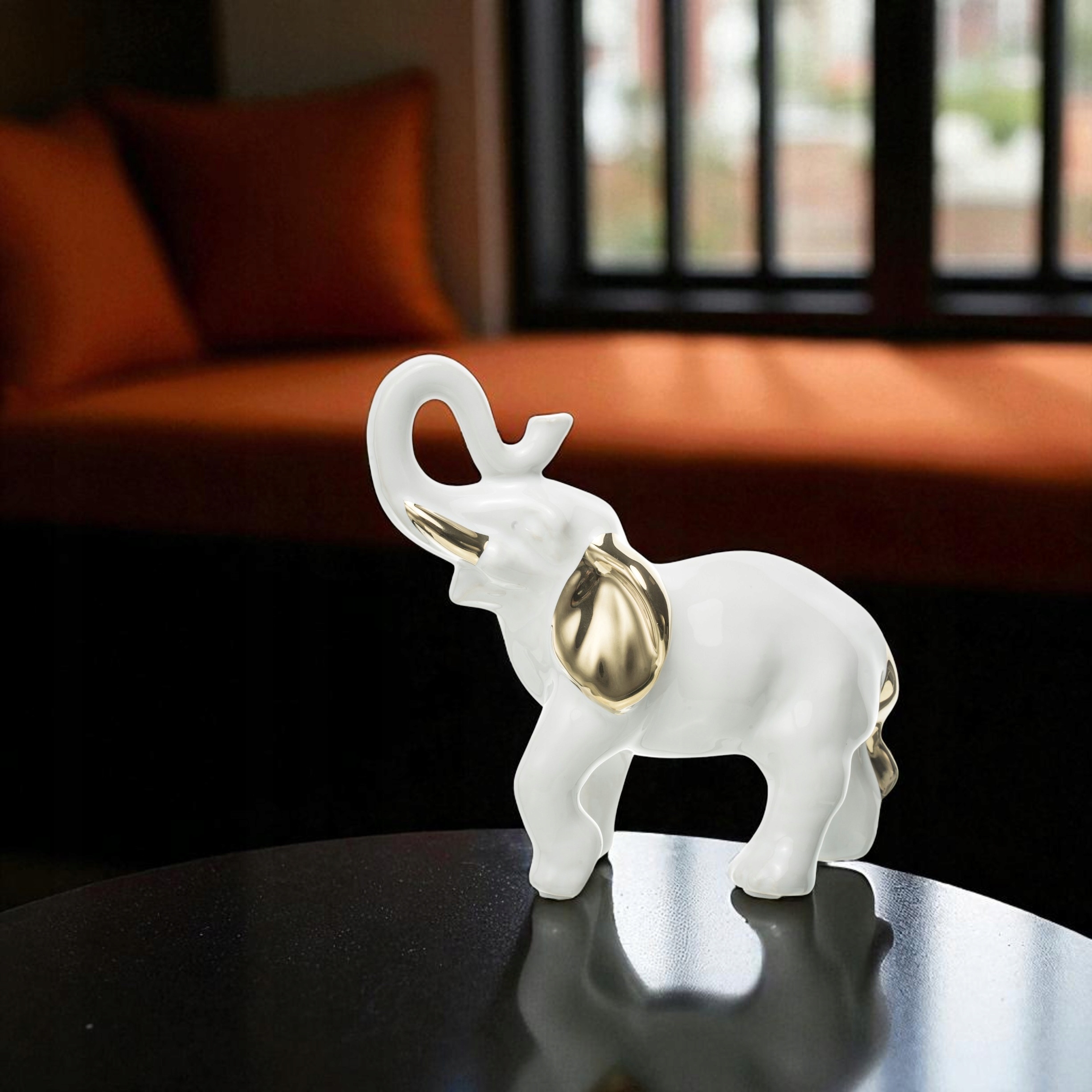 Элегантная статуэтка, изображающая слона с поднятой трубой, символизирующей счастье и процветание. Изготовлен из высококачественной керамики в белом, с красивыми, блестящими золотыми акцентами на ушах, клыками и хвостом.