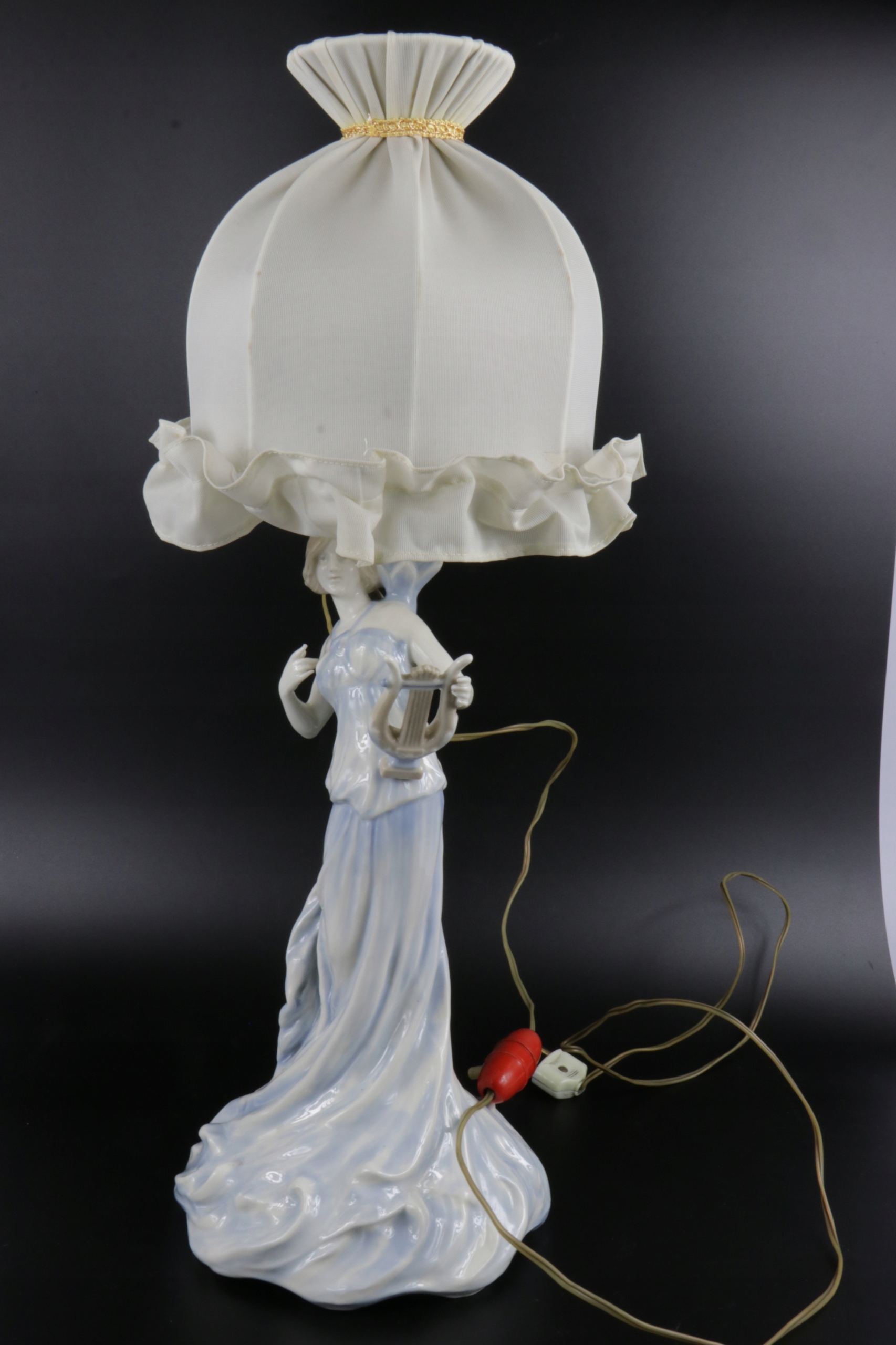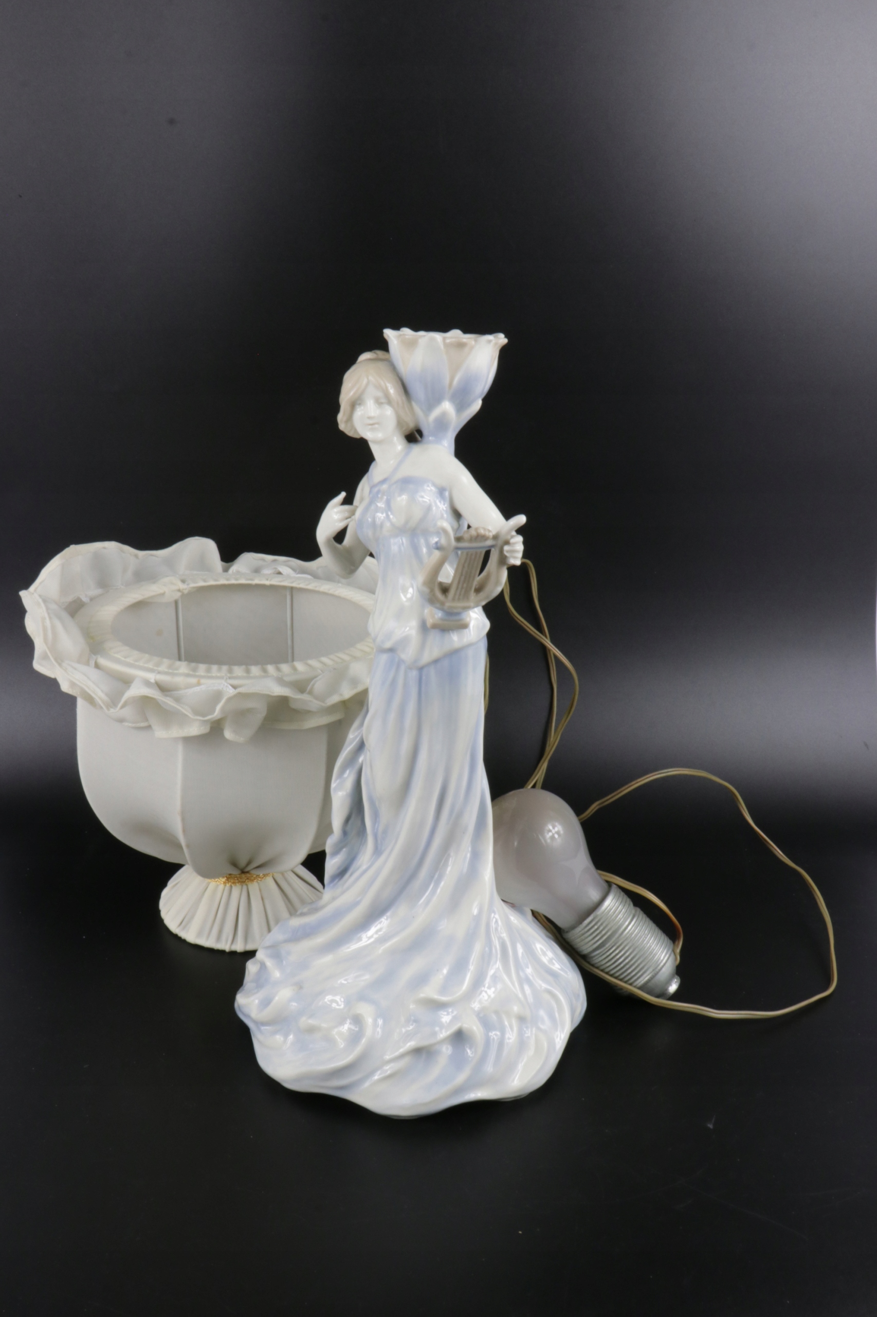 Фарфоровый подсвечник в стиле модерн с цоколем для лампы. Фигурная основа выполнена в виде молодой девушки, держащей в одной руке арфу, платье мягко и волнисто ниспадает вниз, создавая широкую основу для подсвечника, принимающего форму морских волн. Глазурованный фарфор, ручная роспись, цифровая подпись. По-моему, австрийский фарфор, возможно, Амфора.