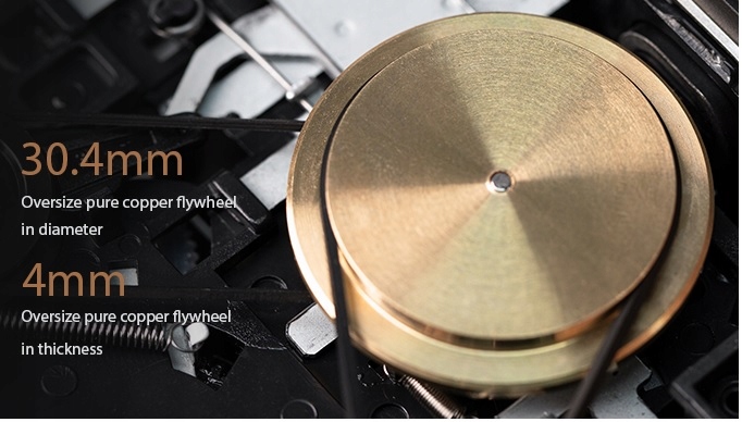 В модели CP13 используется специальный увеличенный маховик из чистой меди диаметром 30,4 мм и толщиной 4 мм. Он изготовлен из материалов более высокого качества и больше, чем те, которые обычно используются в кассетных плеерах. Это позволяет катушке с лентой двигаться максимально плавно во время воспроизведения, тем самым сохраняя вибрацию на очень низком уровне, что в конечном итоге приводит к более стабильному и качественному звуку.