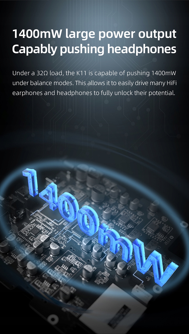При нагрузке 32 Ом K11 способен генерировать до 1400 мВт. Это позволит ему легко раскрыть весь потенциал нескольких наушников HiFi и наушников