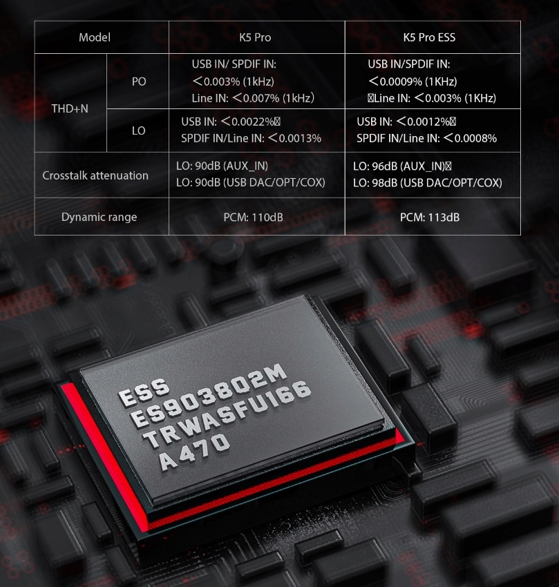 В K5 Pro ESS используется флагманский портативный ЦАП ESS ES9038Q2M, обеспечивающий еще более выдающуюся производительность и более богатую детализацию звука. По сравнению с предыдущим поколением искажения снижены на 50 %, перекрестные помехи гетеродина увеличены на 6 дБ при большем разделении каналов, а динамический диапазон увеличен на 3 дБ.