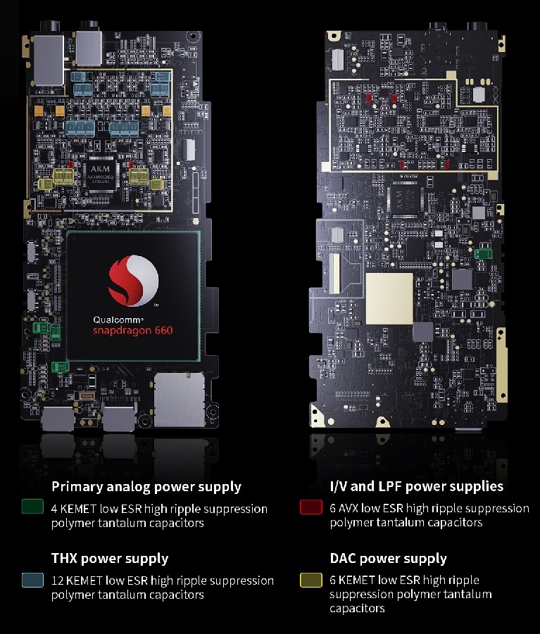 Среди силовых секций усилителя ЦАП, I/V, LPF и THX M23 имеются 28 полимерных танталовых конденсаторов большой емкости, которые хранят большие запасы энергии, которые могут быть высвобождены при необходимости - для обеспечения надежной мощности. мощность и невероятно мощный звук.