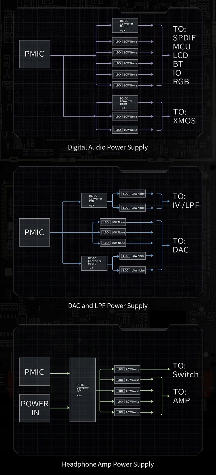 Внутри Q15 находится 15 -аналоговый цифро-аналоговый источник питания - аналоговый с системами питания для цифровой части, аналоговой части, усилителей для наушников и т. д. Он имеет 21 малошумящий LDO для точного регулирования и 35 отдельных танталовых конденсаторов с низким сопротивлением для богатых энергетических ресурсов.