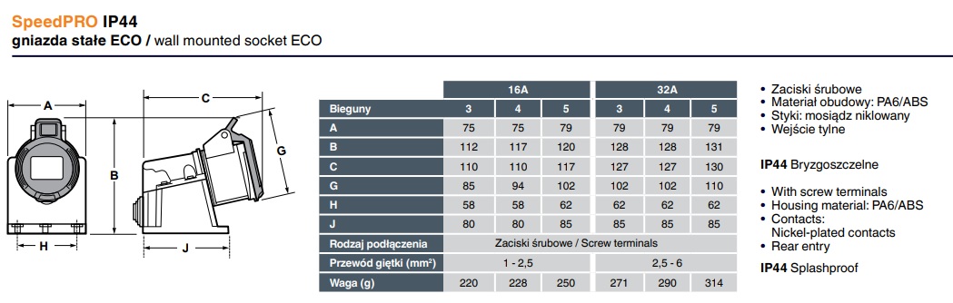 Ээргономика, Nнадежность, Bбезопасность, Sскорость соединения, P б> б>точность. Серия промышленных вилок и розеток SpeedPRO представляет собой сумму всех этих свойств. Разработанные и изготовленные в соответствии с самыми строгими стандартами качества, они гарантируют наилучшие характеристики в экстремальных температурных диапазонах, механическую стойкость и водонепроницаемость.