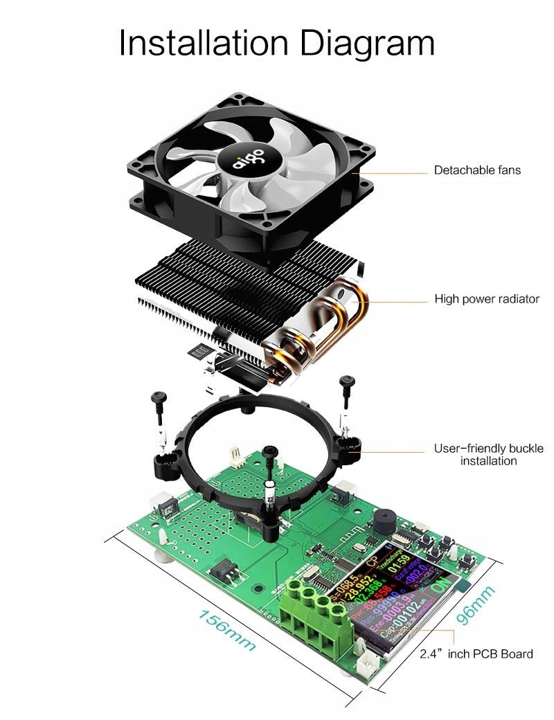 В комплект не входят радиатор с вентилятором и блок питания 12В/1А, необходимые для корректной работы устройства.