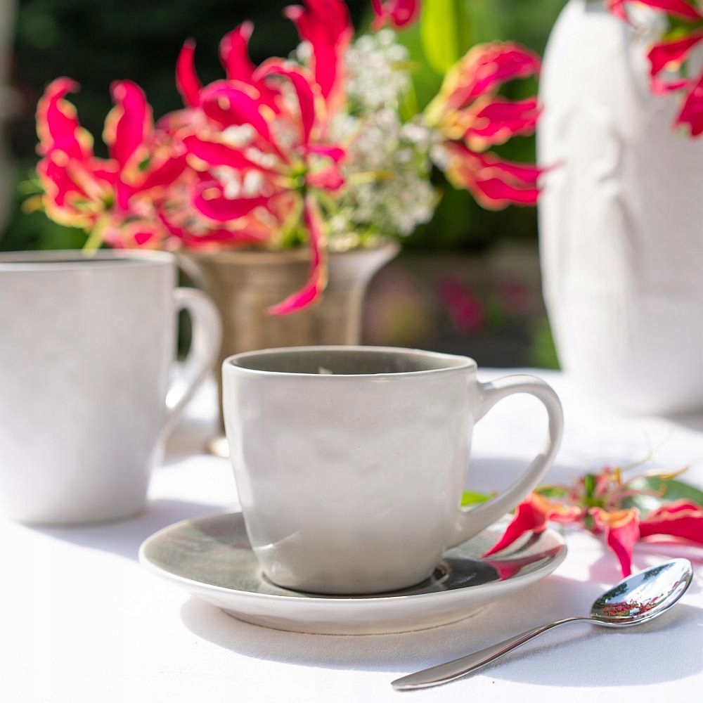 Чашка и блюдце в серых оттенках из коллекции Opal Grey. Опал выделяется интересным дизайном посуды ручной работы. Посуда с одной стороны покрыта глазурью, окрашенной в серый или бирюзовый цвет. Более глубокий слой глазури растрескивается – это целенаправленная процедура, которая вместе с неровной поверхностью сосудов определяет характер и оригинальность коллекции. Внешняя поверхность посуды и дно тарелок остаются светло-серыми и матовыми, но их поверхность гладкая и приятная на ощупь.