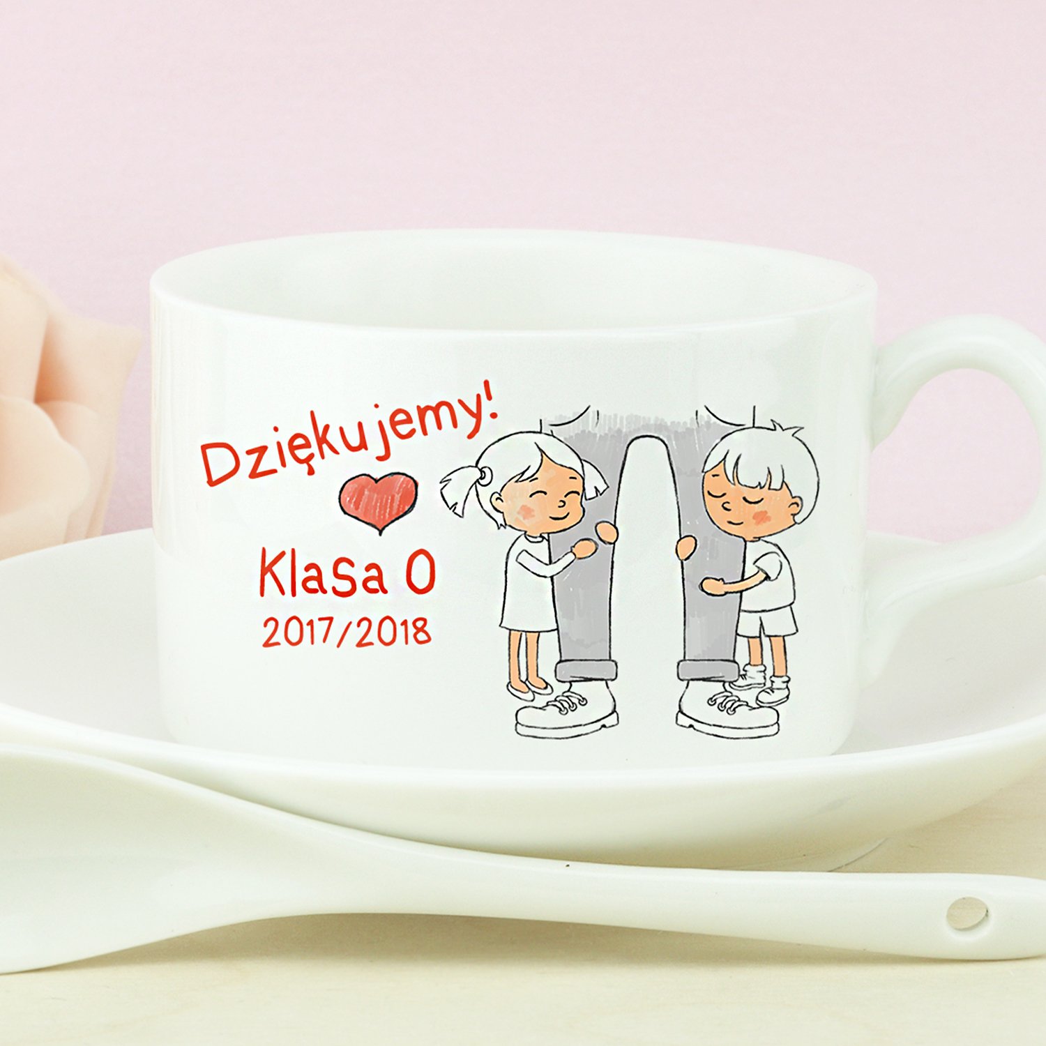 b>подарок в знак благодарности учителю за его старания и работу. В набор также входят ложка и блюдце, выполненные из белой керамики. Мы нанесем отпечаток вашего посвящения прямо на поверхность чашки, все, что вам нужно сделать, это предоставить нам свою подпись и год(ы). Порадуйте учителя всем классом.
