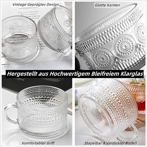- Винтажный дизайн: классическая форма стеклянной чашки имеет изящную круглую изогнутую ручку. Два узора подсолнухов имеют причудливые края в виде мандалы, украшенные подвесками. Регулярно расположенные дождевые точки разных размеров соответствуют типичному ретро-тренду и подходят к любому напитку, который можно подавать даже с водой, используя металлические ложки и бамбуковые крышки, что придает столу элегантный, старомодный вид.