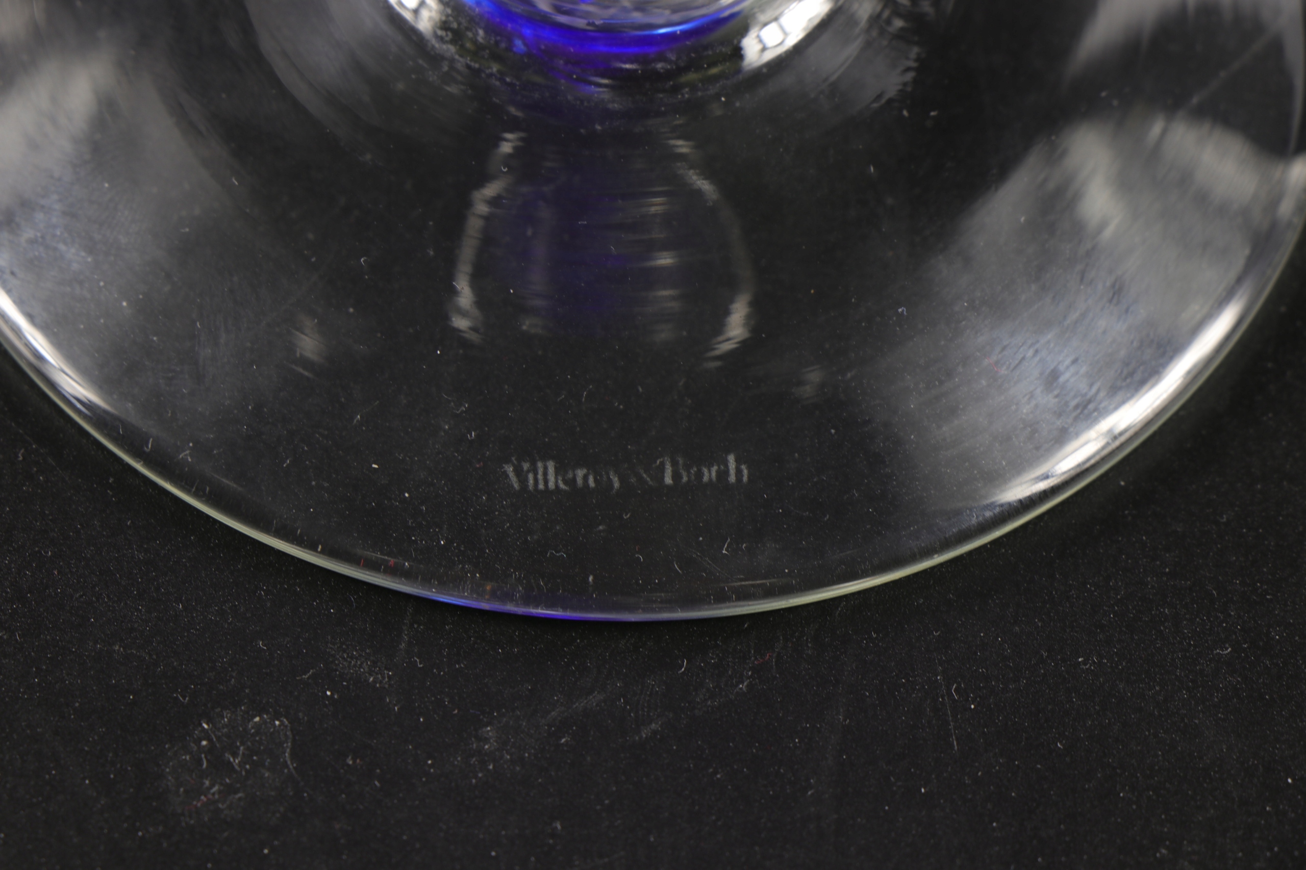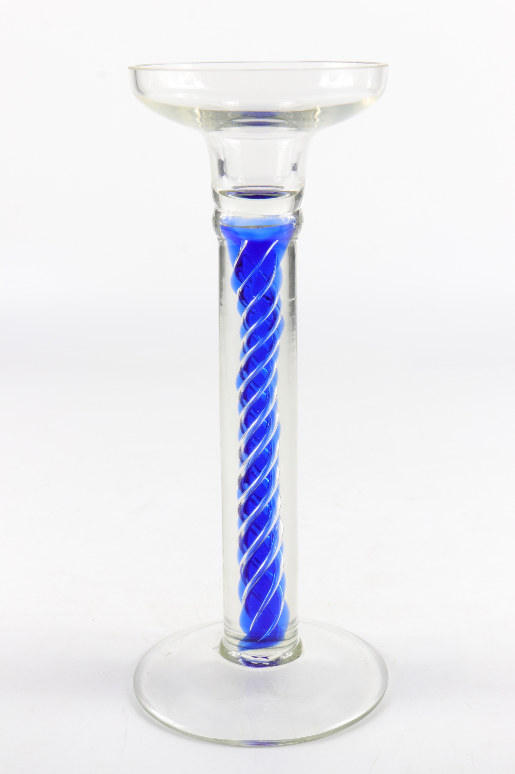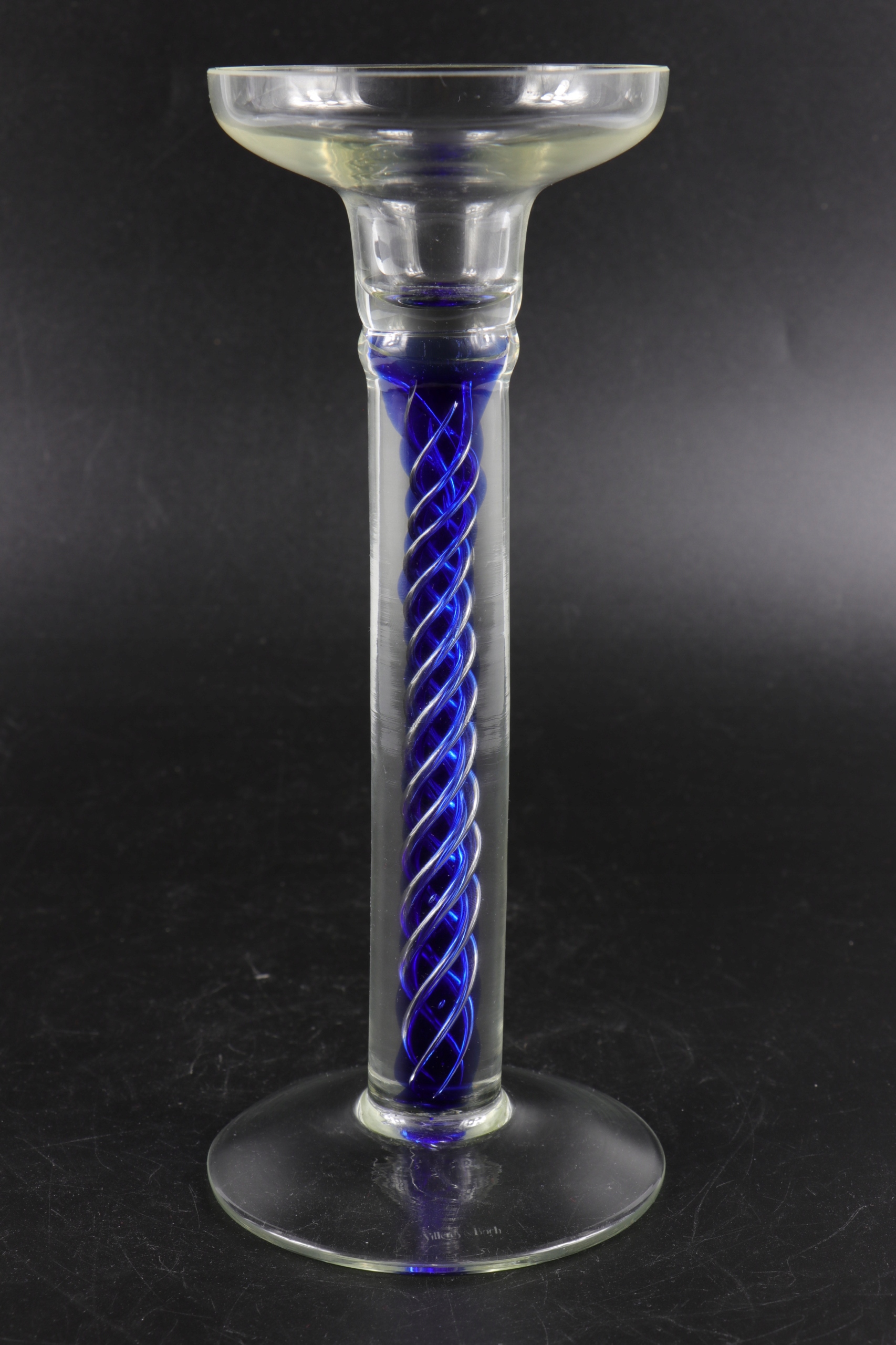 Стеклянный подсвечник с заделанной филигранной переплетенной нитью. Филигрань в массе кобальтового стекла. Подсвечник украшен выгравированной надписью villeroy & boch на основании.