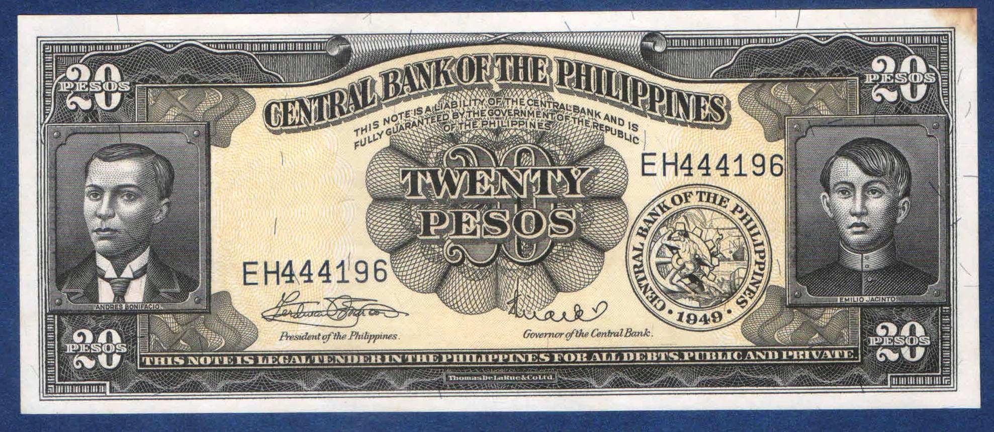 ФИЛИППИНЫ 20 ПЕСО 1949 года P-137e арт. 8 АУНК РЕДКИЕ
