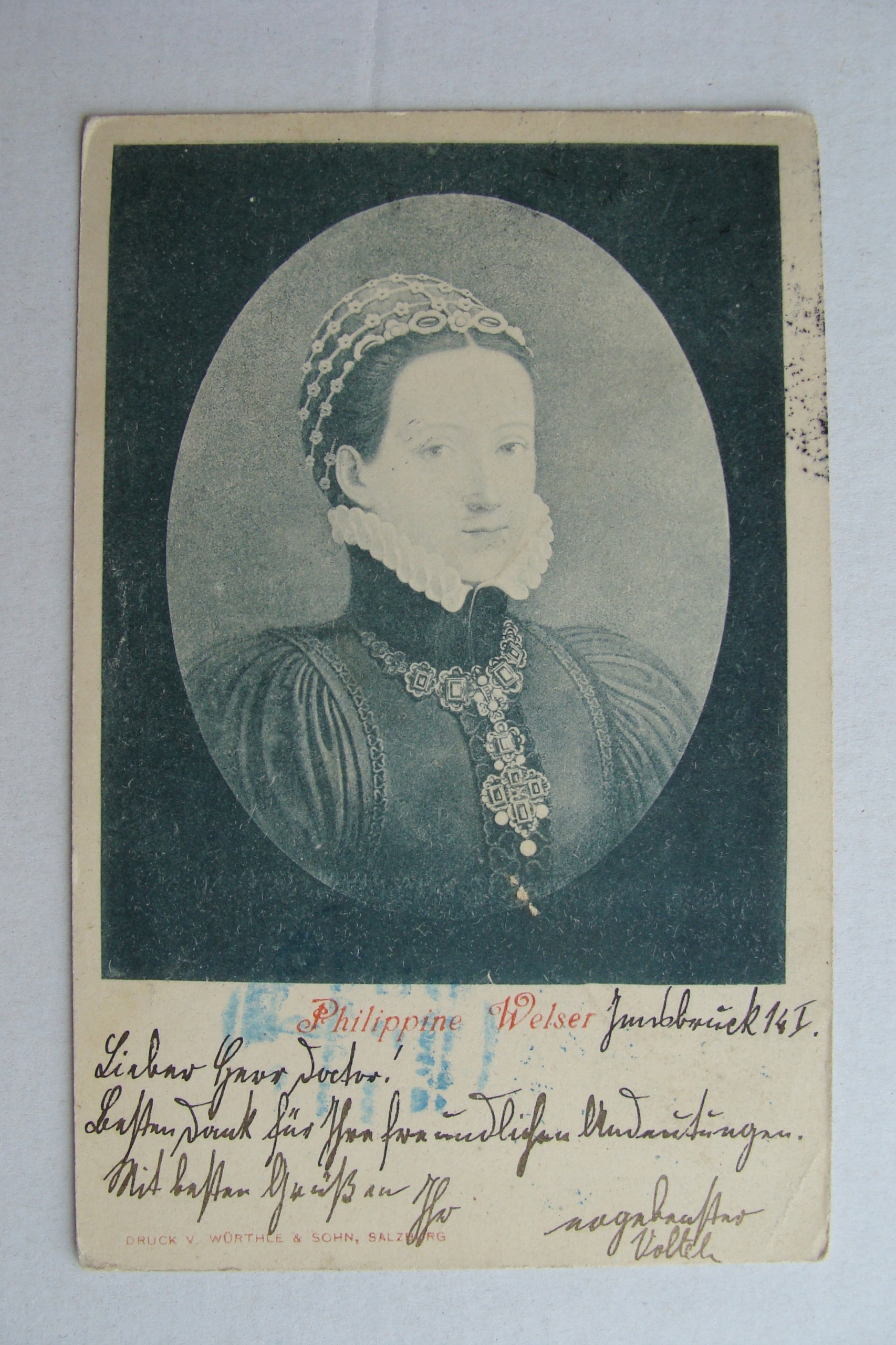 Старая оригинальная довоенная открытка. Оригинал. Выведен из обращения. Филиппинина Вельзер /1527 – 1580/. Графиня де Бургау, Ландгравина де Нелленбург и графиня Верхний и Нижний Гогенберг, герцогиня Циннебургская с 25 июля 1564 по 13 апреля 1580 года, герцогиня цу Амбрас унд Гогенберг с 1578 по 13 апреля 1580 года. В январе 1557 года она тайно вышла замуж за эрцгерцога Фердинанда. II Габсбург, граф Тирольский, губернатор Богемии, кандидат на польскую корону. Датировка: довоенная открытка. Состояние: на мой взгляд: хорошее, потертости углов, грязь, все видно на сканах. Смело совершайте покупки.