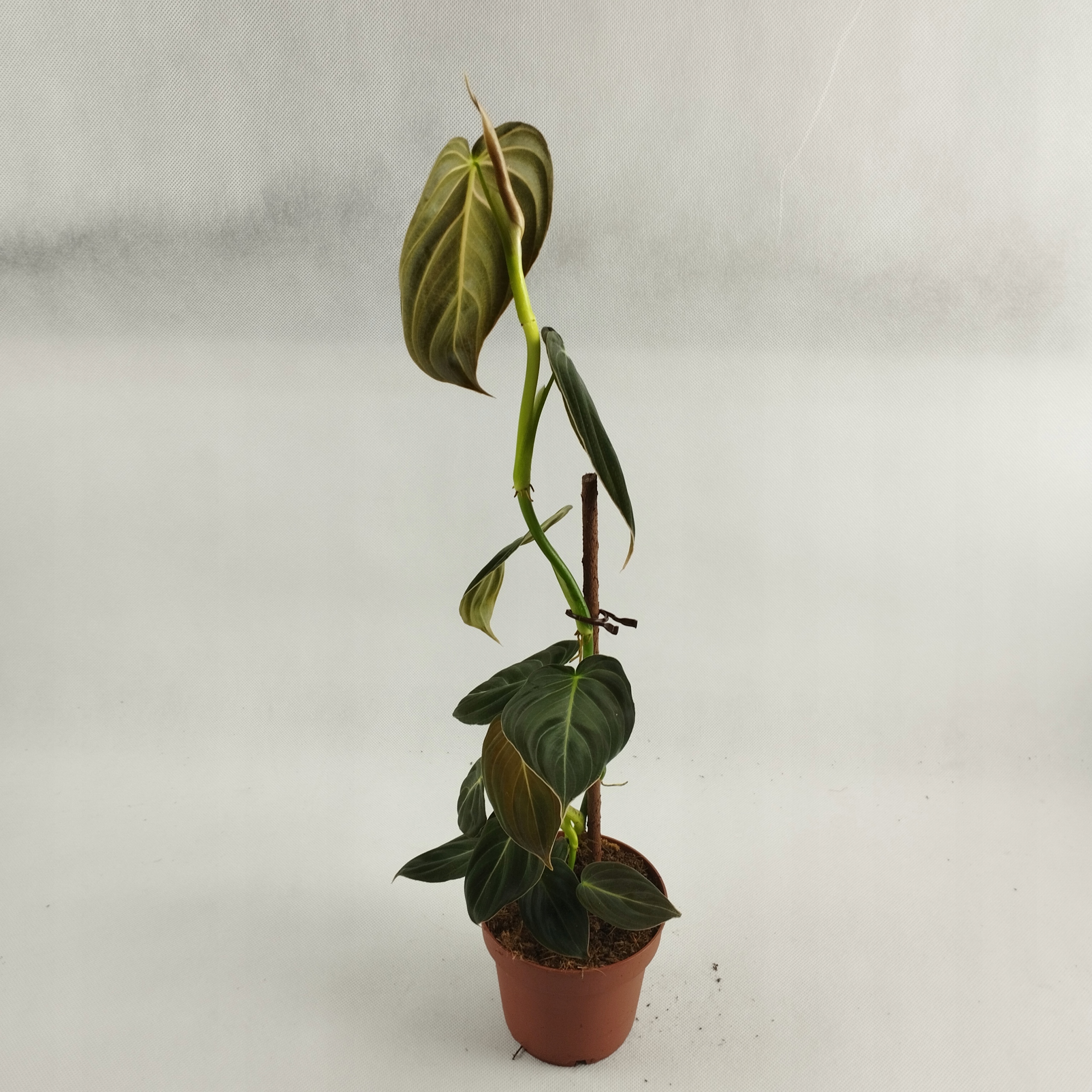 Philodendron melanochrysum – один из самых красивых филодендронов, который, помимо крупных размеров, впечатляет исключительно эффектными листьями. В природе растет в тропических лесах преимущественно Колумбии, Эквадора и Перу. Это изменчивый вид, и листья каждого экземпляра могут немного отличаться друг от друга. Изменчивость также заметна на разных стадиях роста. У молодых растений листья мелкие и широкие, вначале ало-коричневые и кожистые, со временем становятся темно-зелеными. Спелые листья радуют своей бархатистой текстурой и почти черно-зеленым цветом, красиво переливающимся мягким бархатом в лучах света. Бледно-зеленые нервы красиво очерчиваются на фоне темной, бархатистой зелени. В конечном итоге листья будут иметь сердцевидную и очень вытянутую форму. При домашнем выращивании они обычно достигают около 30 см в длину, но у более старых экземпляров, выращенных в идеальных условиях, могут достигать 90-100 см в длину. Характерно их вертикальное отклонение от длинного черешка, на котором они закреплены. Филодендрон меланохризум, выращенный на опоре, будет иметь более крупные и длинные листья, расположенные в виде крыши, что придает ему феноменальный внешний вид. Коллекционный вид, предназначенный для продвинутых любителей экзотических домашних растений!