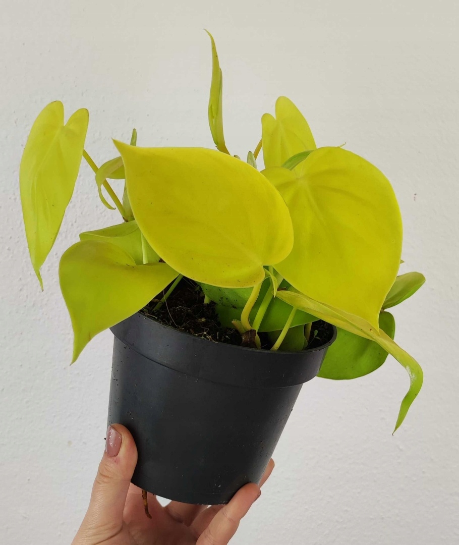 - Филодендрон лазящий лимонно-лаймовый, высотой примерно 15-25 см, измерен в горшке диаметром 12 см.