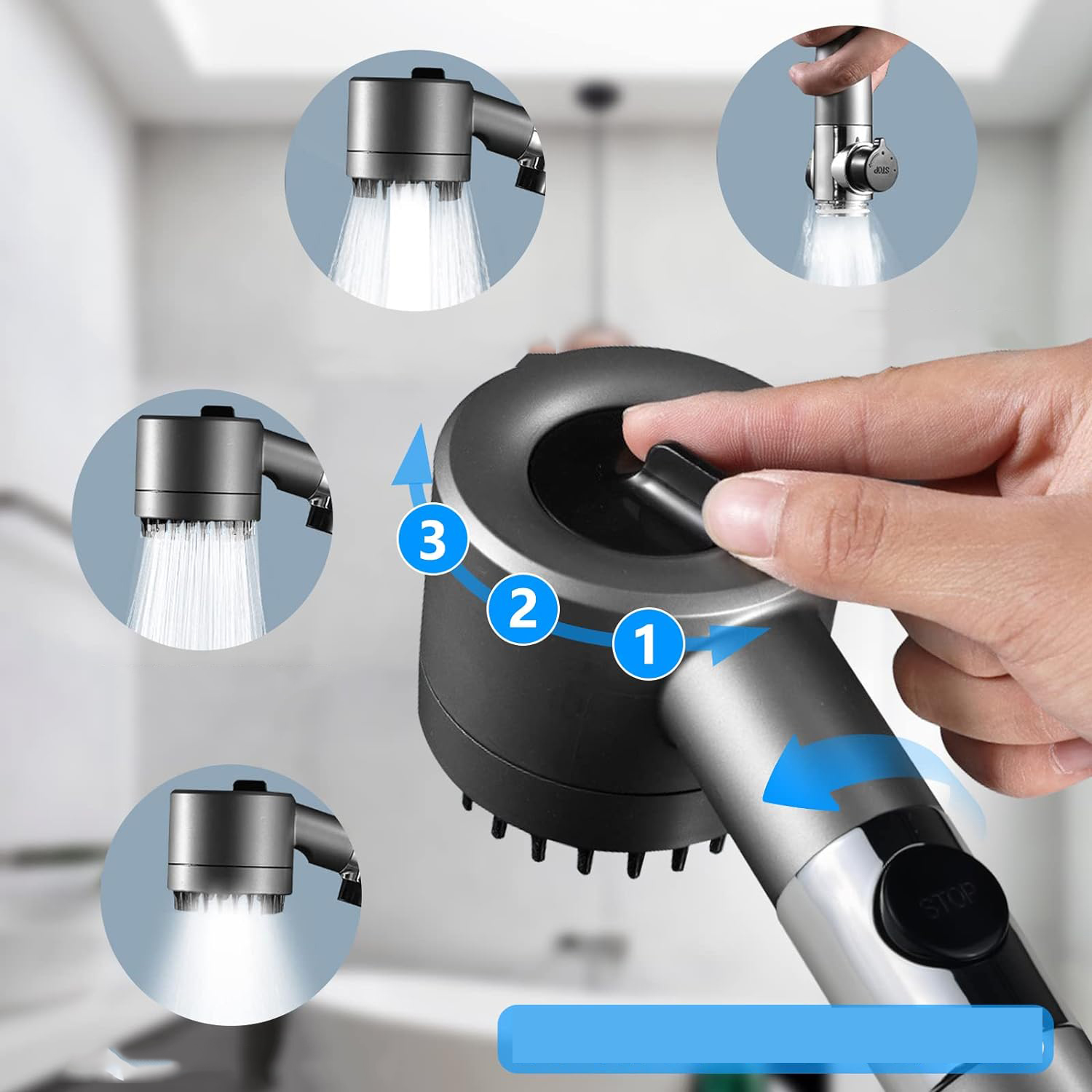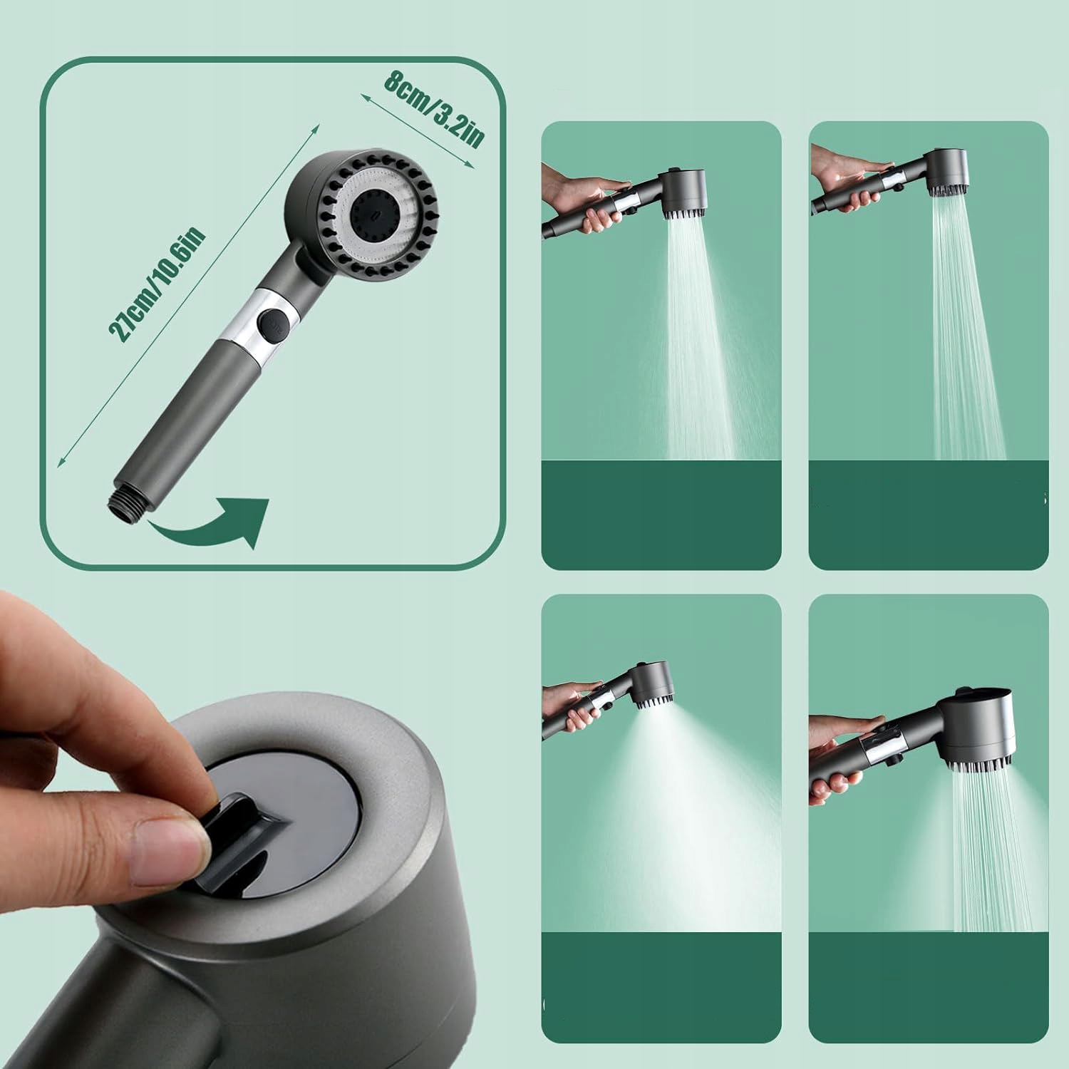 -Этот душ доступен в режиме струи (успокаивающий и нежный), режиме дождя (мягкая вода), режиме смешивания (сильный пульс) и режиме ополаскивания (снимите насадку).