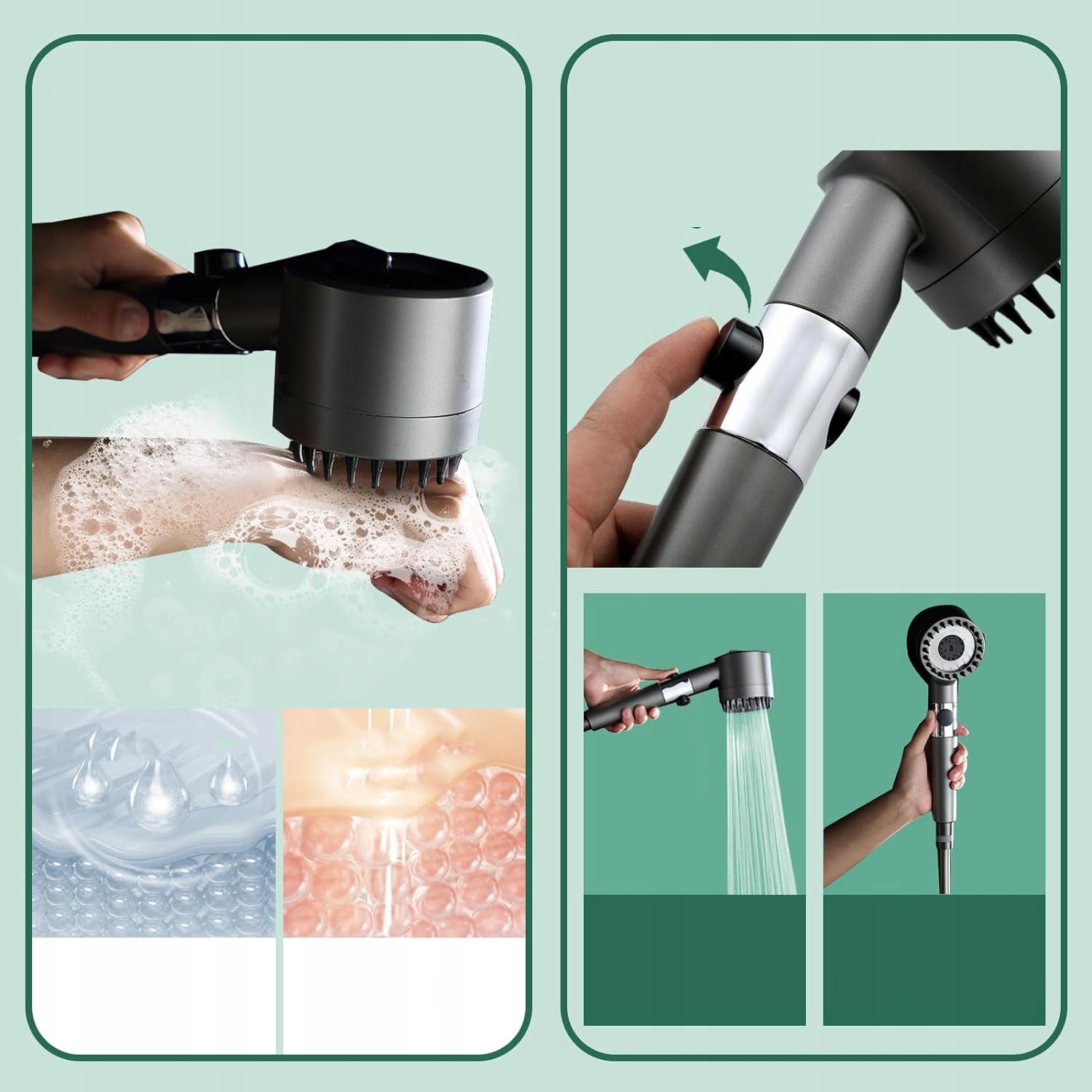 Насадка для душа имеет мягкую гибкие силиконовые щетки, позволяющие скользить по волосам, не спутывая их и не вытягивая, массируя кожу головы, регулируя зуд, улучшая кровоток и регулируя напряжение.