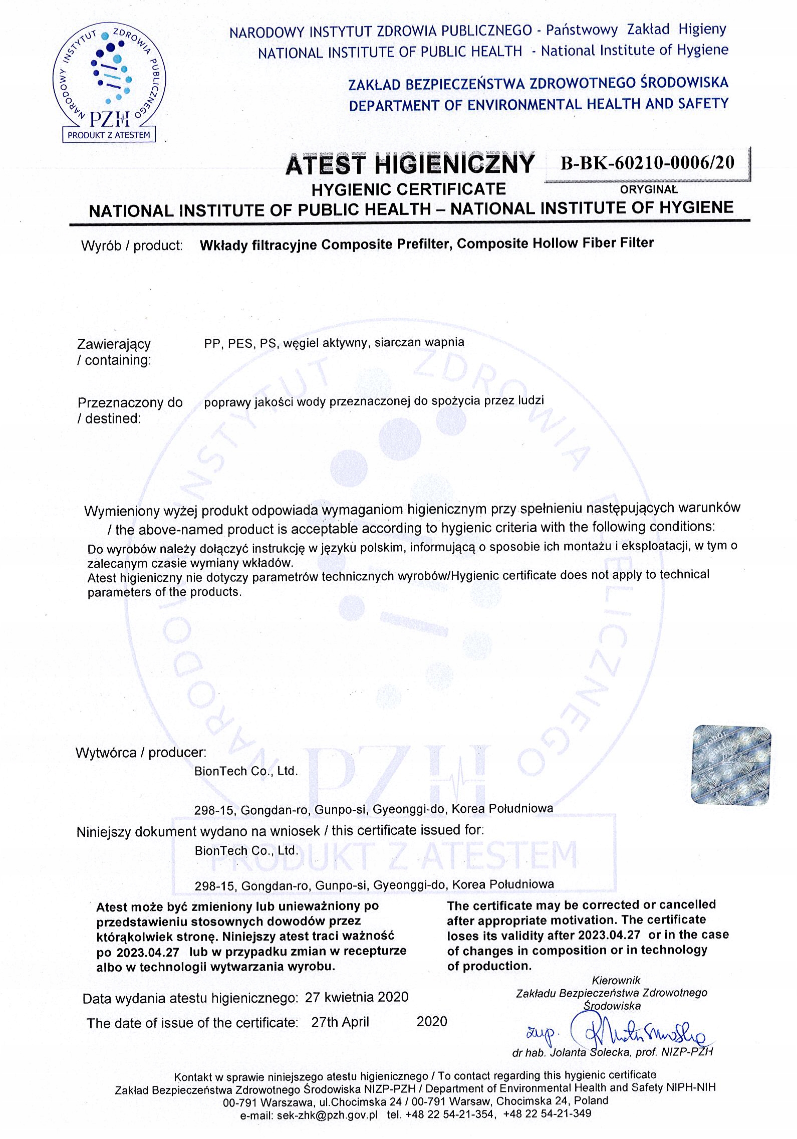 Фильтр сертифицирован Национальным институтом общественного здравоохранения ПЖ