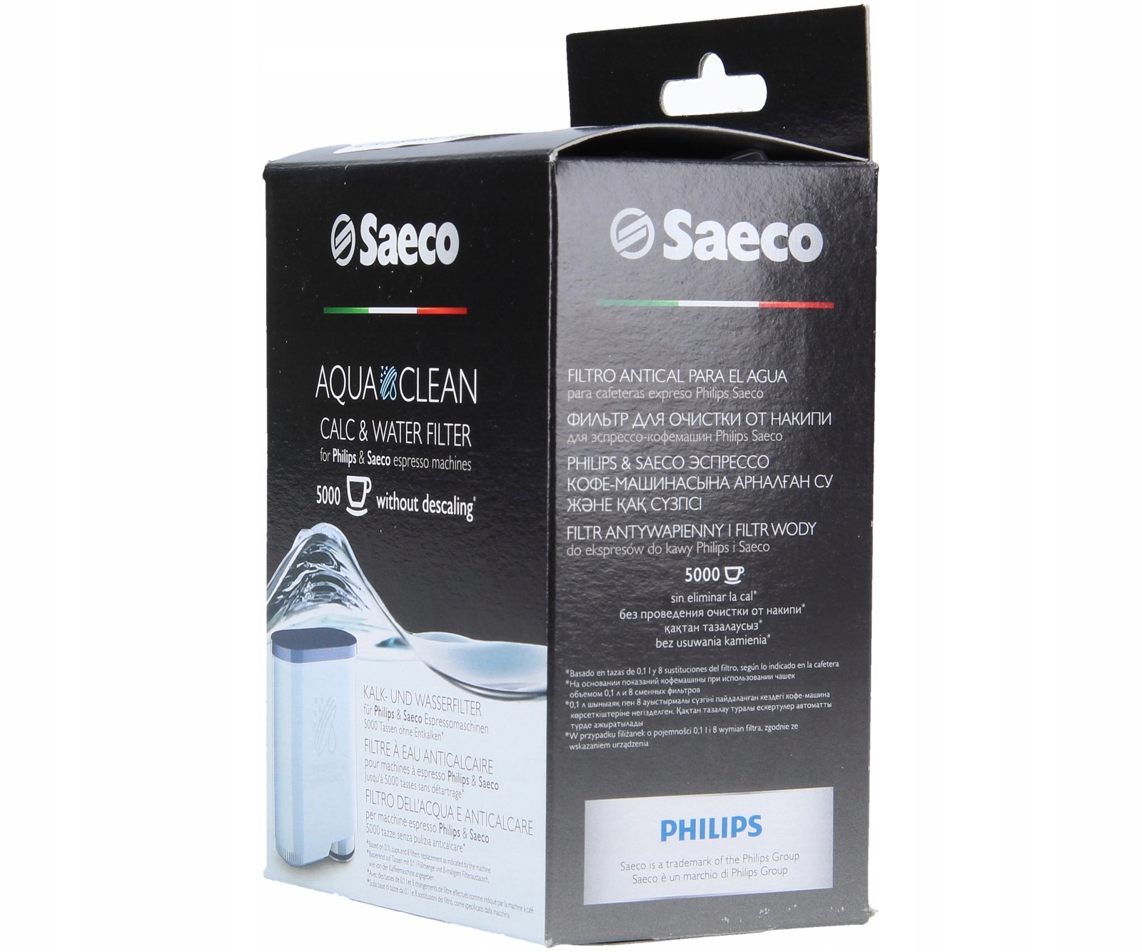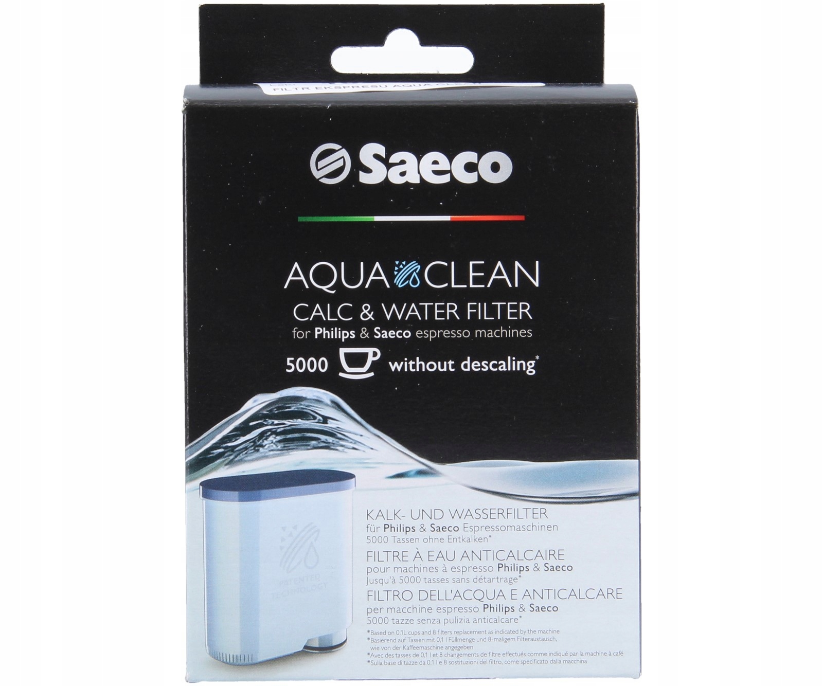 Запатентованный фильтр AquaClean от Saeco позволяет в полной мере воспользоваться возможностями кофемашины Saeco. Заменяя фильтр каждые 3 месяца, вы можете обеспечить гигиенически чистую и свободную от загрязнений воду без необходимости очистки машины от накипи (максимум 5000 чашек - для чашек емкостью 0,1 литра и 8 замен фильтров).