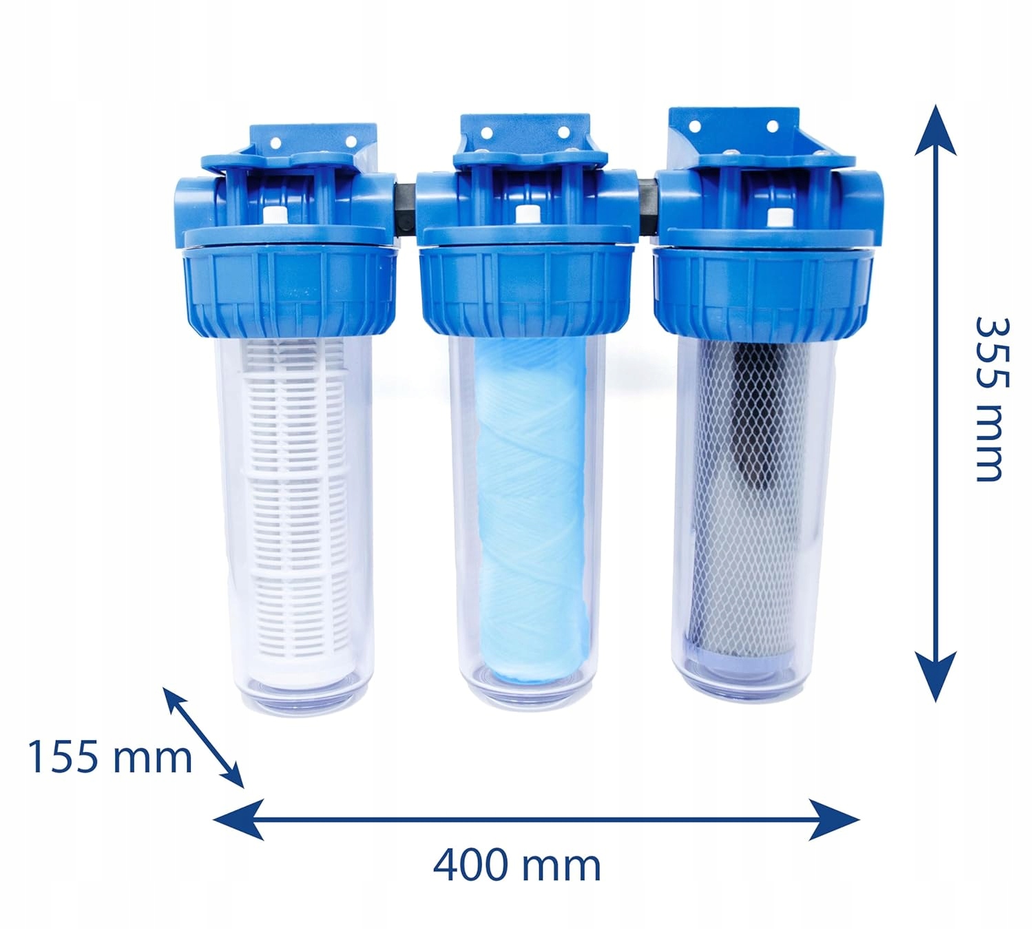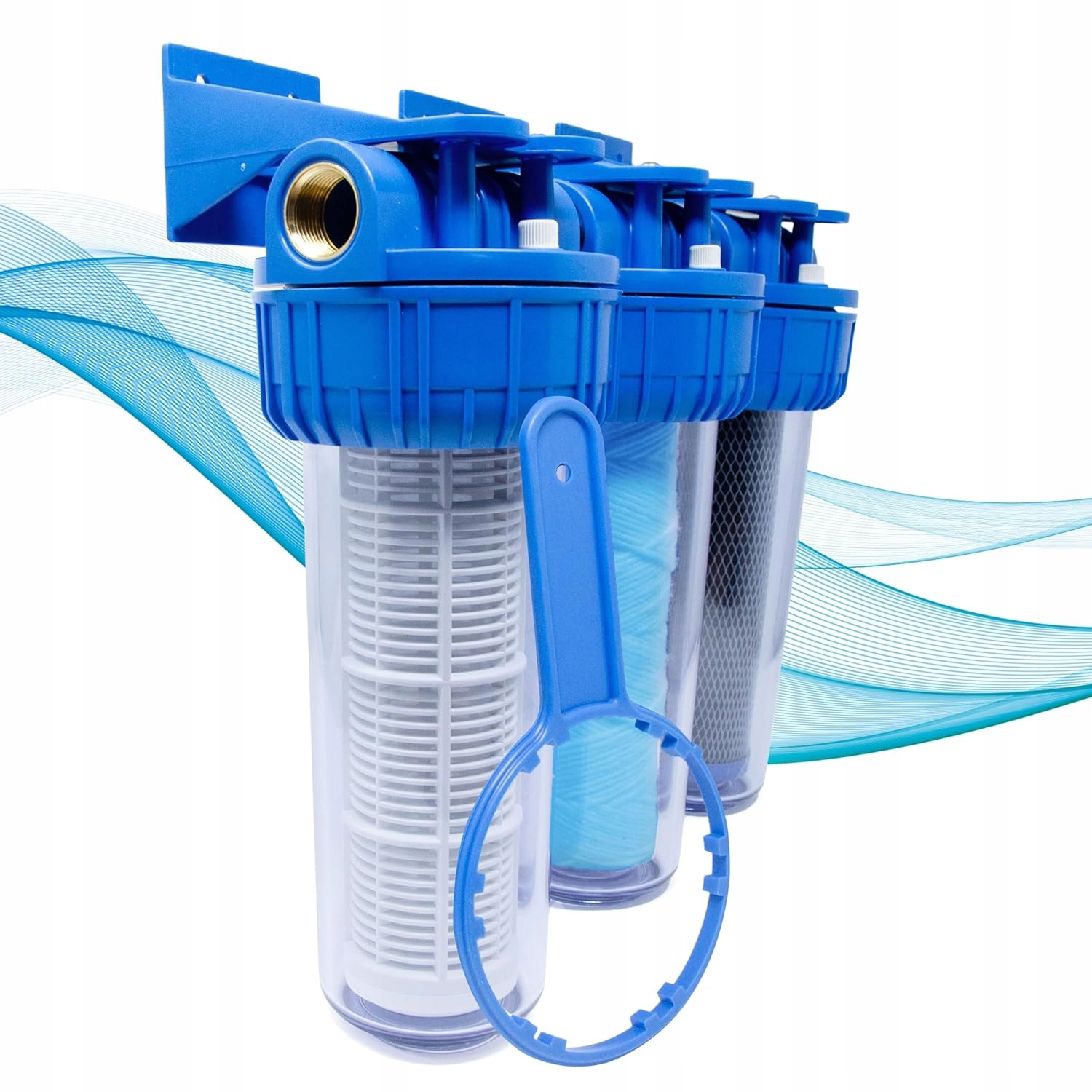 Система трехступенчатой фильтрации с латунными фитингами диаметром 3/4" - комплексное решение для очистки воды в вашем доме. В комплект входит ключ для открытия контейнера фильтра и фильтровальные картриджи, обеспечивающие полную защиту благодаря трем уровням фильтрации. Это идеальный выбор для удаления загрязнений, осадков и хлора, которые могут повлиять на качество питьевой воды.
