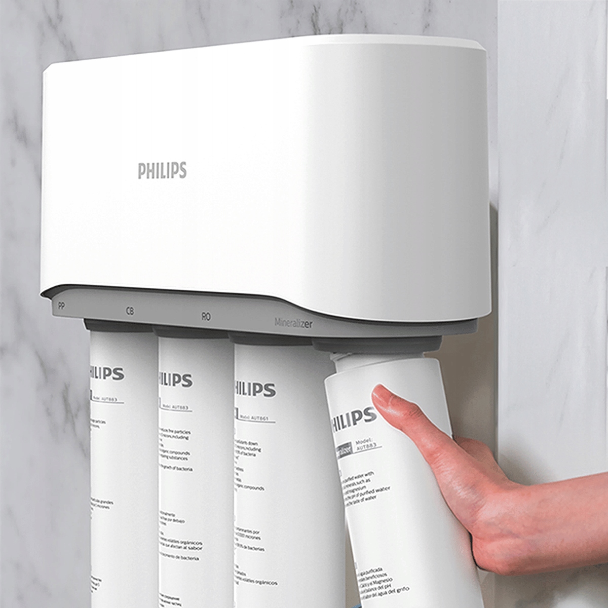 Модель Philips AUT7006 можно легко установить в кухонном шкафу, подсоединив его гибкими шлангами к крану.