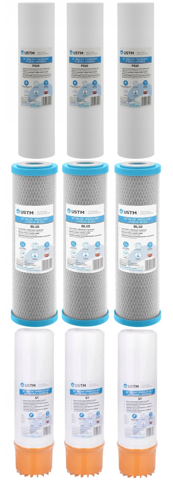 - 3 картриджа фильтра для умягчения воды UST-M размером 3 x 10 дюймов.