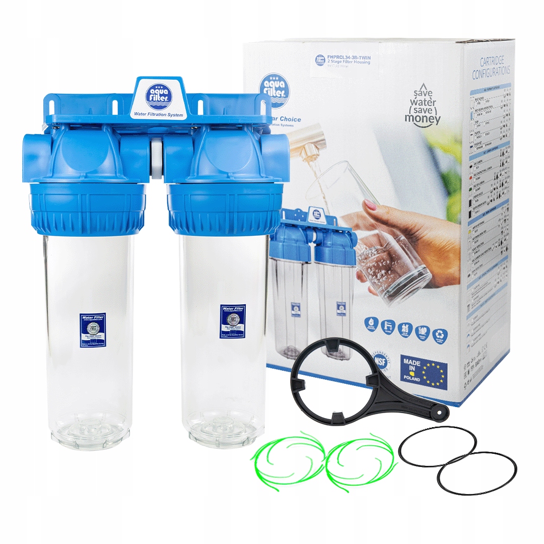 FHPRCL34-3B-TWIN — простой в эксплуатации установите двухступенчатый фильтр для воды для использования на главном водопроводе в квартирах или домах. Фильтр имеет соединительную резьбу диаметром 3/4 дюйма. Используем только для холодной воды.