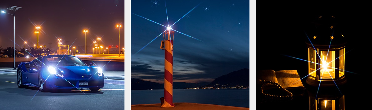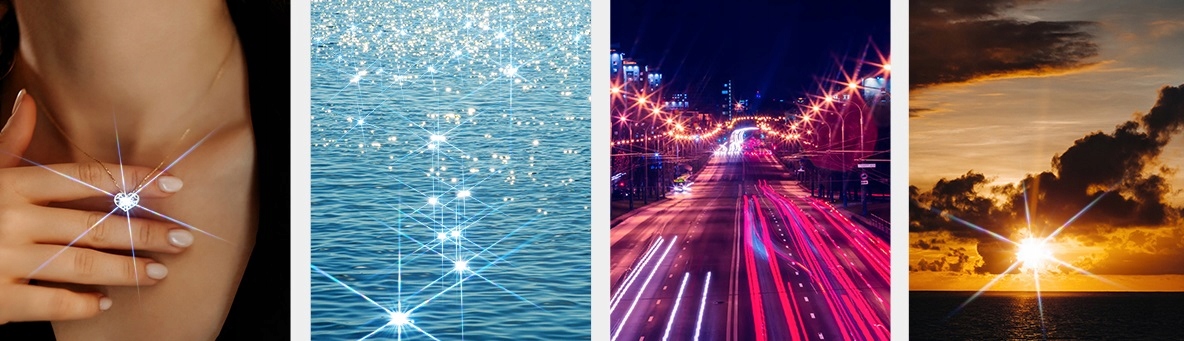 С помощью трех звездных фильтров x8, x6 и x4 вы можете создать на фотографии эффект восьмиконечной, шестиконечной или четырехконечной звезды, где есть вспышка солнечный свет или другие источники света, такие как лампы, фонари, уличные фонари, автомобильные фары, пламя свечей.