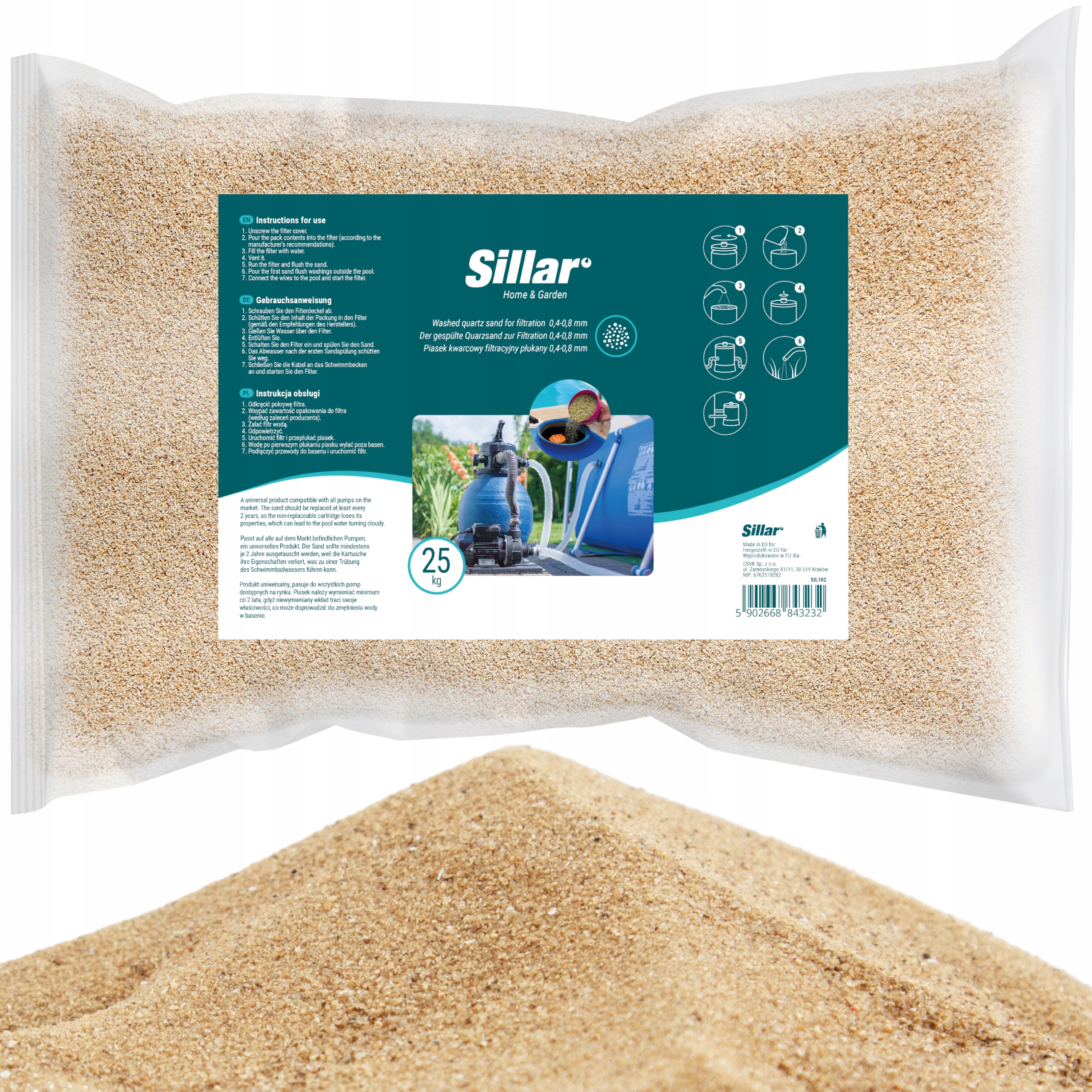 ПЕСОК ДЛЯ ФИЛЬТРОВ КВАРЦЕВЫЙ SILLAR ПРОМЫВАННЫЙ ДЛЯ НАСОСОВ ДЛЯ БАССЕЙНОВ 0,4-0,8 мм - 25 кг