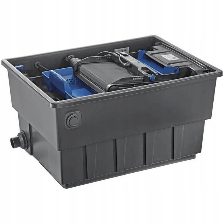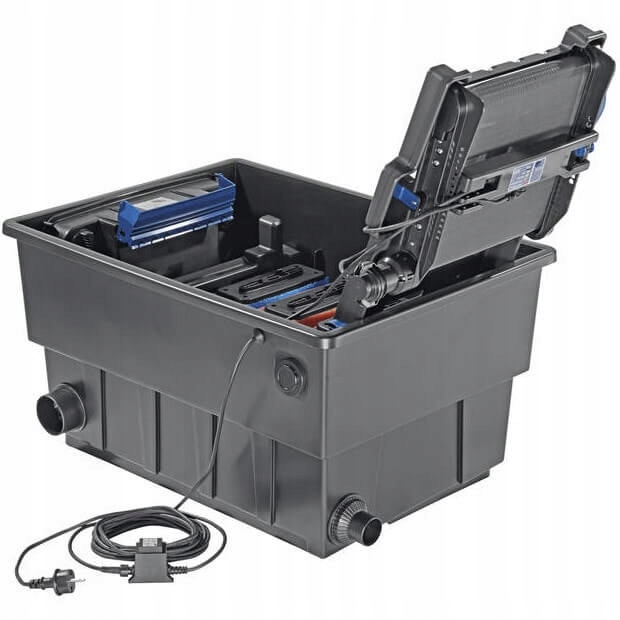Переливной фильтр Oase BioTec ScreenMatic² 40000 для пруда или пруда, обеспечивающий полную механическую и биологическую очистку воды. Фильтр комплектуется набором фильтрующих картриджей – 2 синих губки, 3 красных губки, 3 фиолетовые губки и 2,5 кг специальных гранул. Губки эффективно задерживают более крупные виды загрязнений во время потока воды, а также обеспечивают поверхность для осаждения полезных нитрифицирующих бактерий, расщепляющих органические загрязнения.