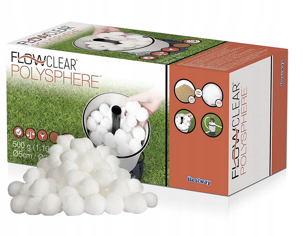 Универсальный фильтрующий элемент последнего поколения Polysphere Flowclear — экологически чистая альтернатива обычному кварцевому песку благодаря более длительному сроку службы и превосходным свойствам фильтрации и удержания. Специальные фильтрующие шарики из микроволокон ПЭТ (полиэтилентерефталат) различной длины и структуры способны очистить воду в вашем бассейне в 10 раз быстрее и эффективнее.
