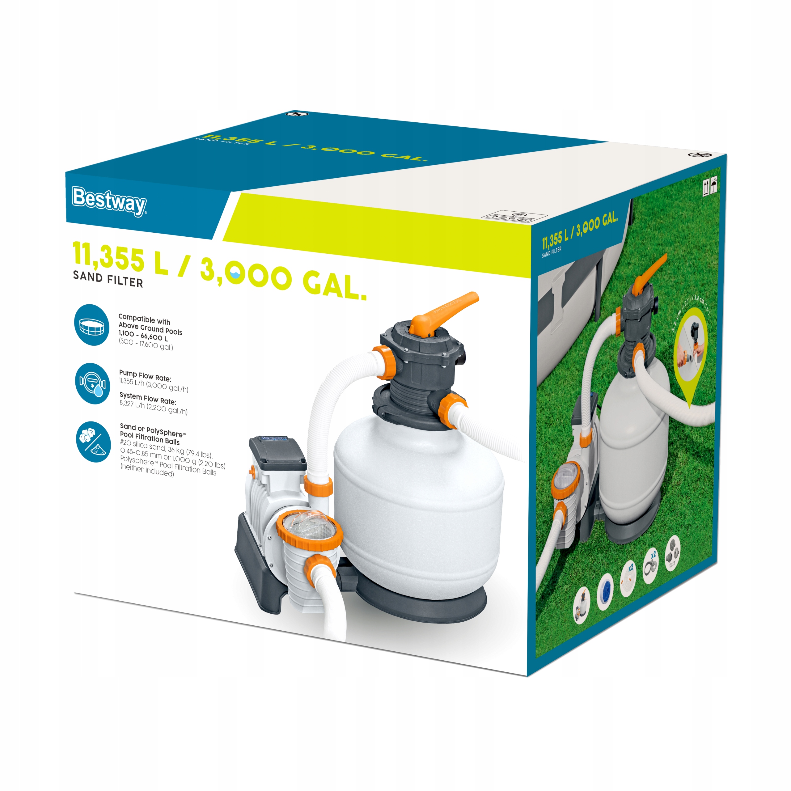 Насос песчаного фильтра Bestway® является высокоэффективным и экологически чистым способом поддерживать чистую воду через грунт. Это прибыльное решение, потому что насос использует песок кремнеземам вместо традиционной вставки фильтра. В то время как традиционные картриджи должны заменяться каждые 2 недели, кремнезый песок достаточно на 3 года. Песок улавливает грязь и примеси, но предварительно фильтерный резервуар фильтрует большие вещи, благодаря тому, что насос будет длиться дольше. Продукт собирается на заводе и совместим с большинством наземных бассейнов с емкостью от 1100 до 6600 л, поскольку он оснащен адаптерами для клапанов бассейна с внешним диаметром 3,8 см.