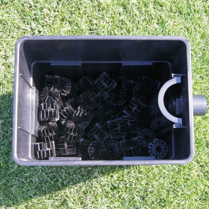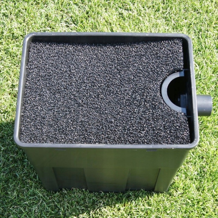 Специальный фильтр с входом и выходом воды в верхней части фильтра делает фильтр частично похороненным, так что он так же видимо в саду. или поток).