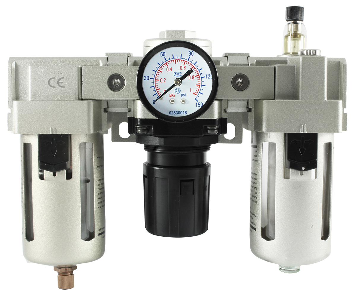 Профессиональный сетевой фильтр с воздушным редуктором и масленкой, модель FAC 3000-03. Фильтр предназначен для удаления твердых и жидких частиц из сжатого воздуха. Фильтрующая вставка с размером частиц 40 мкм, конденсатоотводчик с ручным отводом конденсата. Редуктор с манометром, оснащенный стопорной ручкой. Масленка ниппелей, модуль с монтажными кронштейнами.