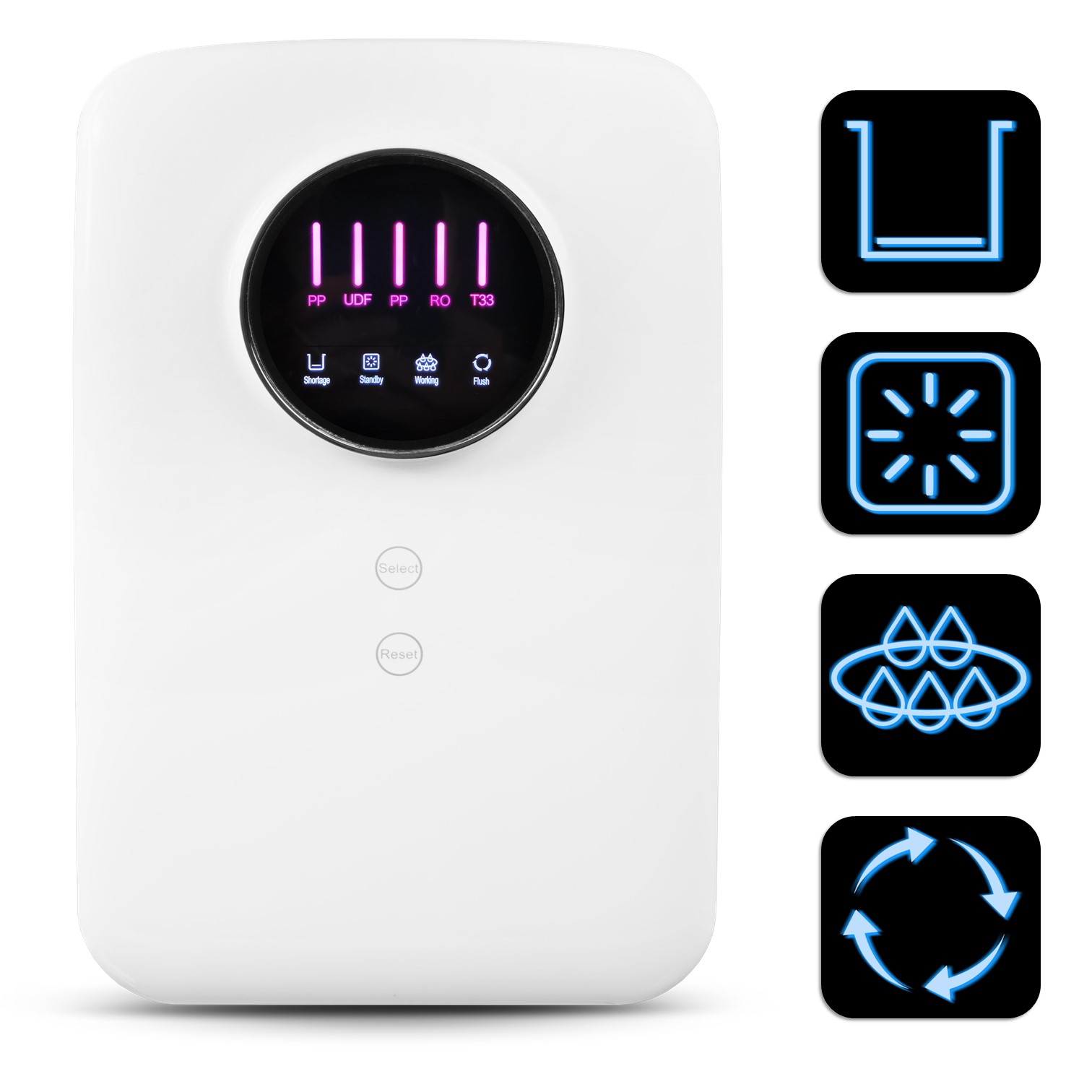 В сочетании с высокоэффективной технологией экономии воды оно поможет вам сэкономить на счетах за воду. Интеллектуальное программное обеспечение, разработанное для работы системы, продлевает срок службы мембраны и других частей электрического управления. Устройство имеет функцию напоминания о сроке службы фильтрующих элементов. Система автоматически прекратит работу при обнаружении утечки, умный дисплей продолжит мигать со звуковым сигналом.