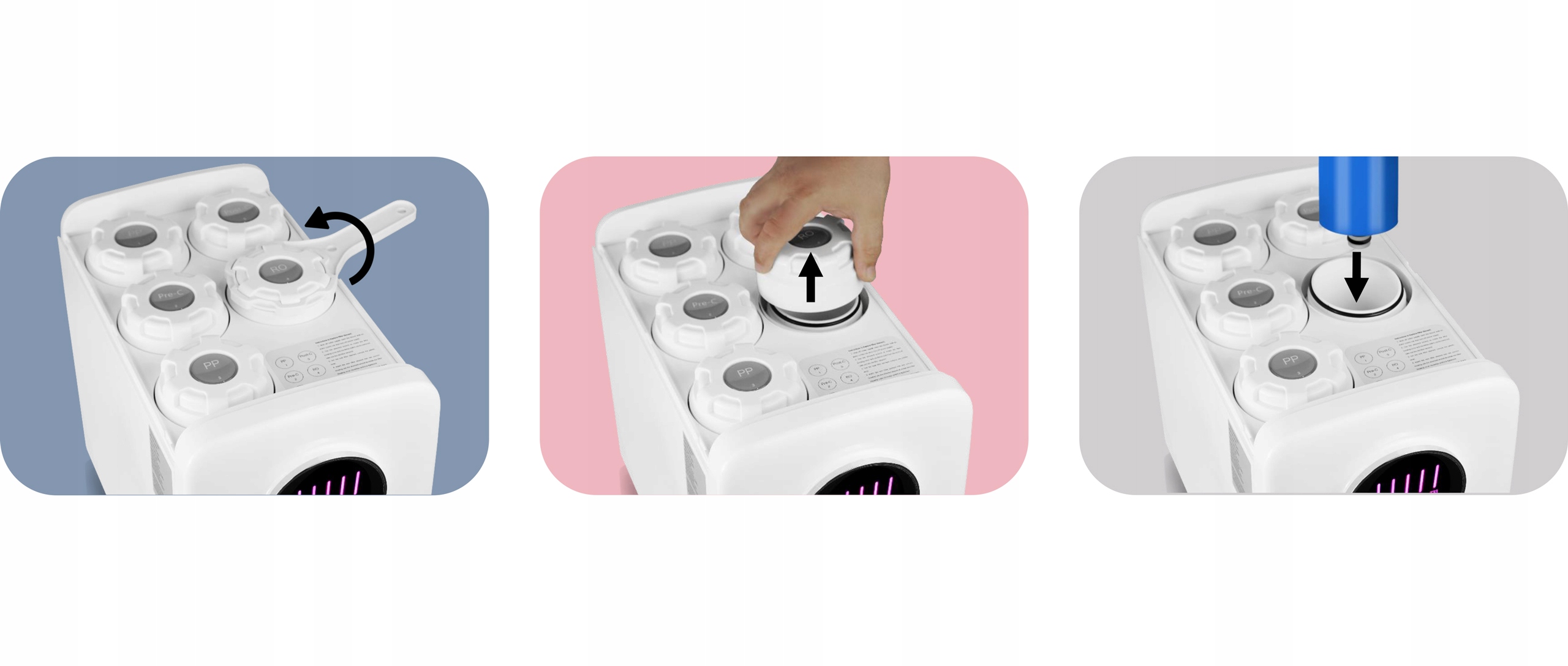 Для установки или обслуживания устройства не нужен специалист, поскольку оно было разработано так, чтобы сделать его эксплуатацию простой и интуитивно понятной для каждого. Для замены картриджа открутите гайку корпуса, извлеките использованный картридж, вставьте новый и затем прикрутите его обратно. Система подходит для стандартных пластин диаметром 10 дюймов.