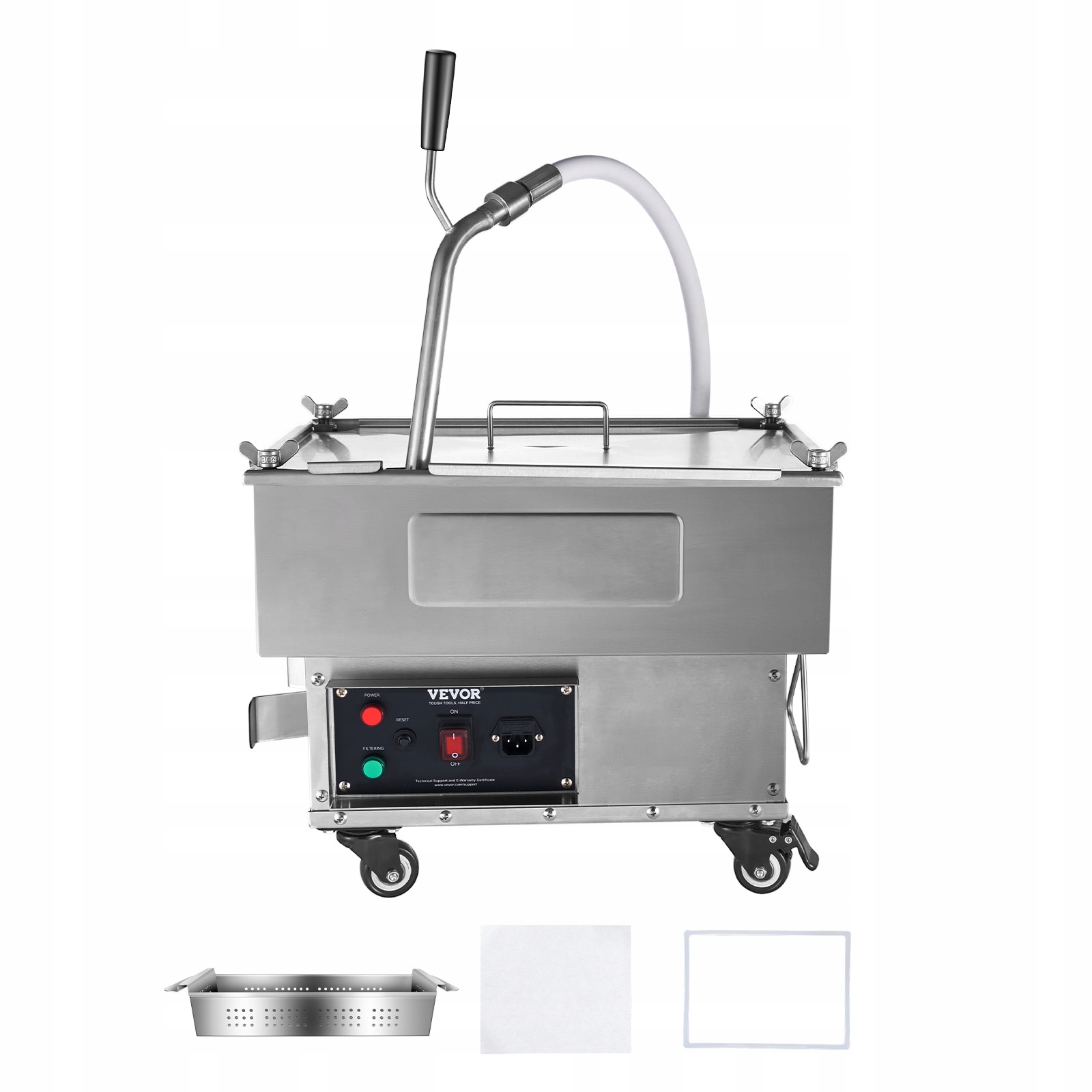 Благодаря устойчивой змеи змеи к высоким температурам, ручка, подключенная к устройствам дома, вы можете свободно отфильтровать масло. Более того, перемещение этого коммерческого фильтра в фритюрник - это простые дети благодаря четырем колесам и длинной ручке!