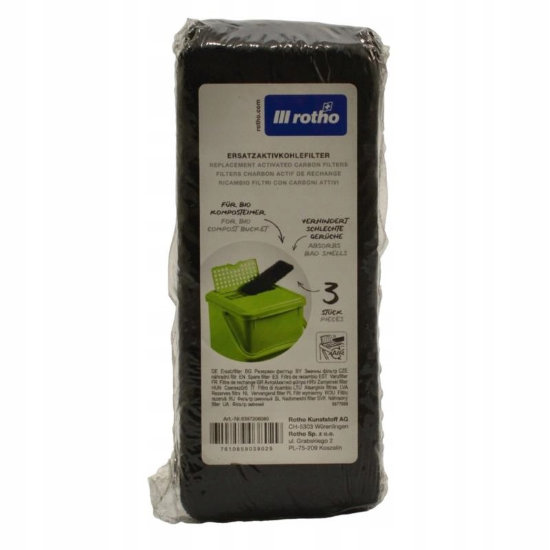 <р> Фильтры помещаются в мусорные баки БИО емкостью 8 литров. <р> Фильтр сохраняет свои свойства в среднем около 2-3 месяцев (в зависимости от использования). <р> Чтобы фильтр правильно выполнял свою функцию, т. е. поглощал нежелательные запахи, его ни в коем случае нельзя мыть. <р> Особенности: <р> Комплект фильтров с активированным углем для ведра Rotho Bio 9 литров. <р> Фильтр с активированным углем вставляется в крышку ведра для компостирования и нейтрализует образующиеся газы <р> Размеры: около 150x65x35 мм (длина/ширина/высота) <р> Цена указана за комплект из 3 штукНомер ссылки: 038029