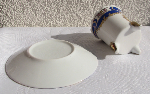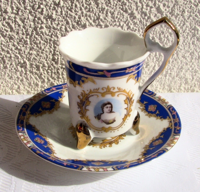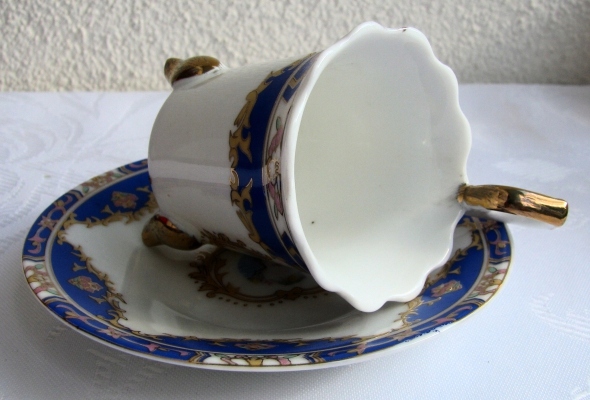 24 карата (на фарфоре маркировки нет, но она была на коробках). На чреве чашки и середине блюдца изображение – портрет женщины. Чашка на трех ножках. Элегантная, высокая ручка чашки притягивает взгляд.