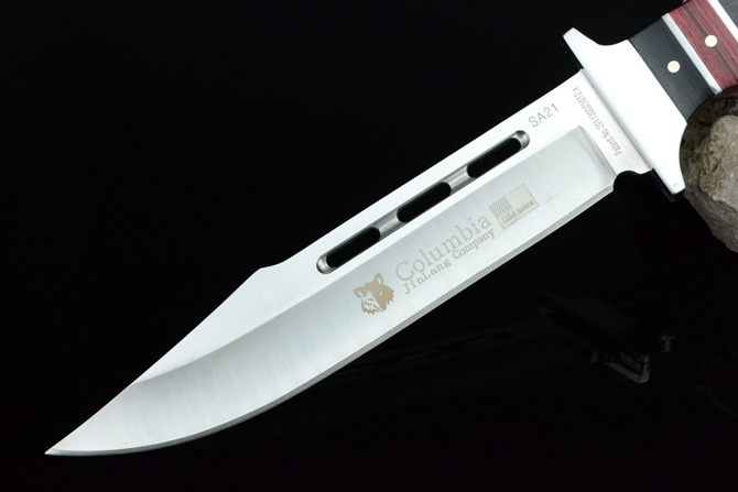 Лезвие охотничьего ножа большое, изготовлено из хорошей стали, отполировано до блеска.