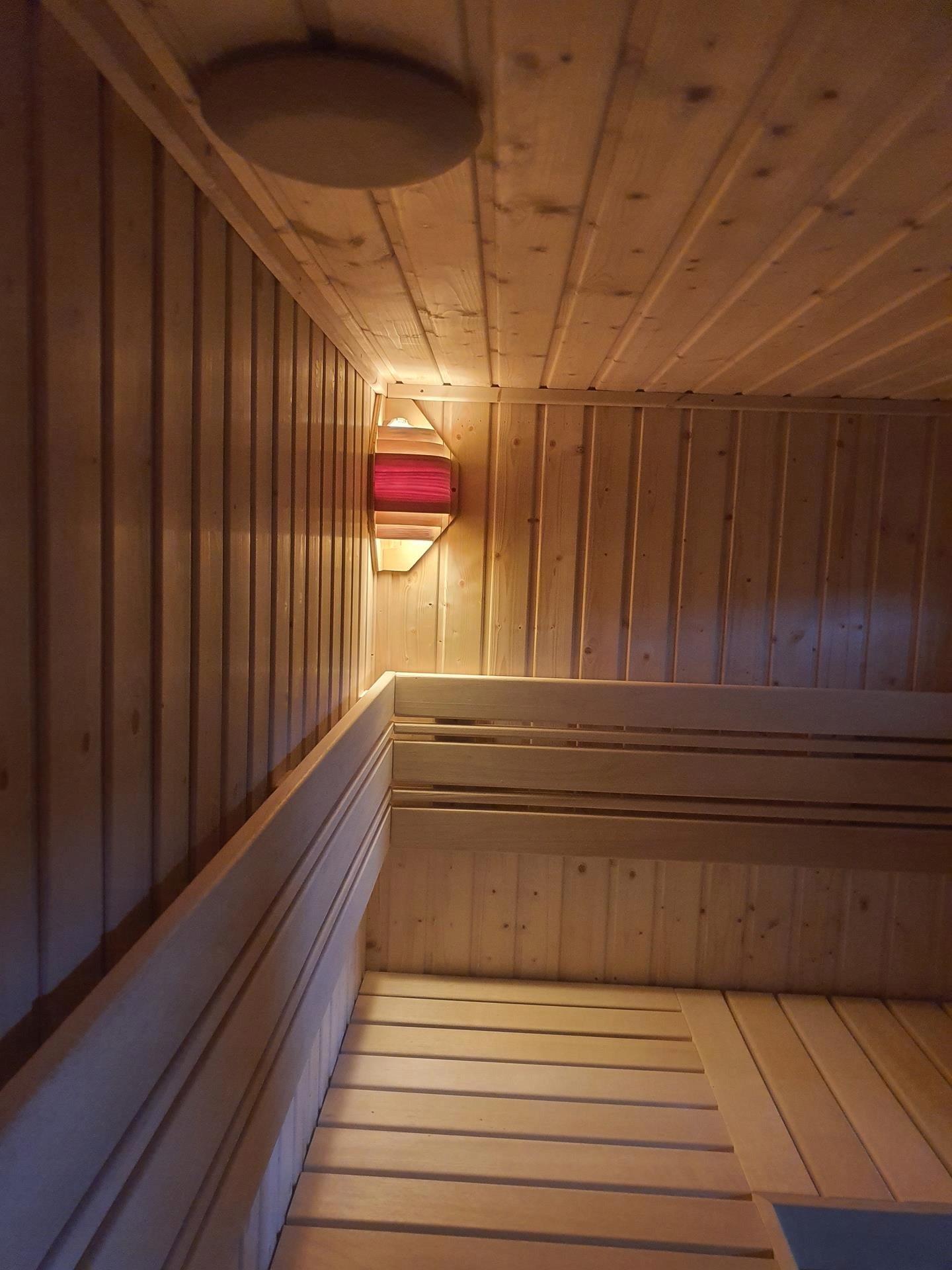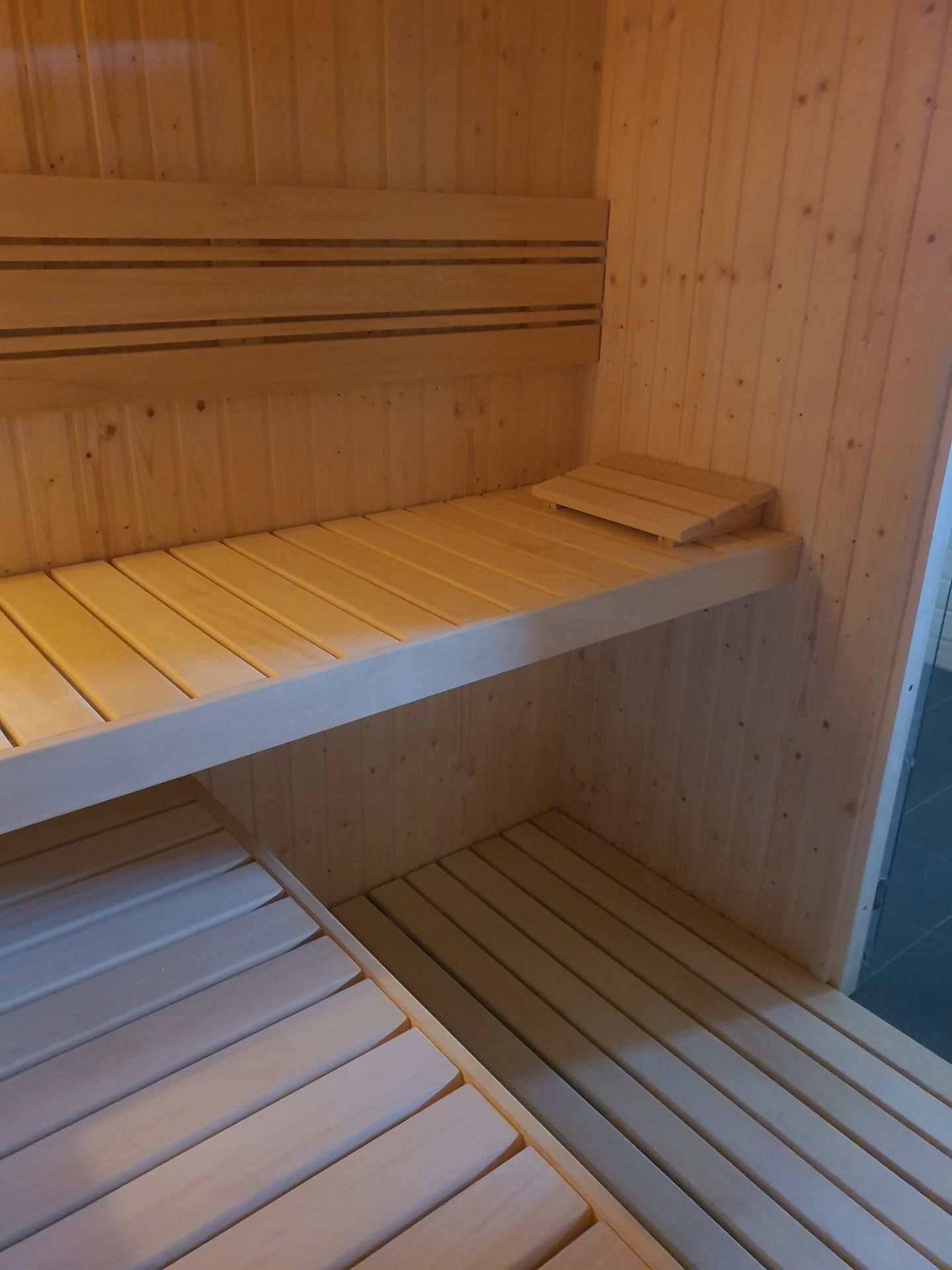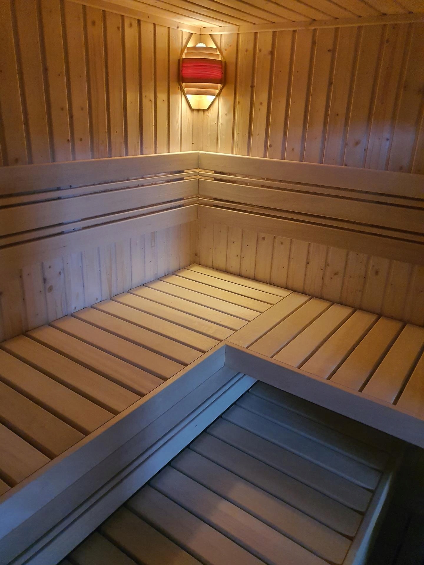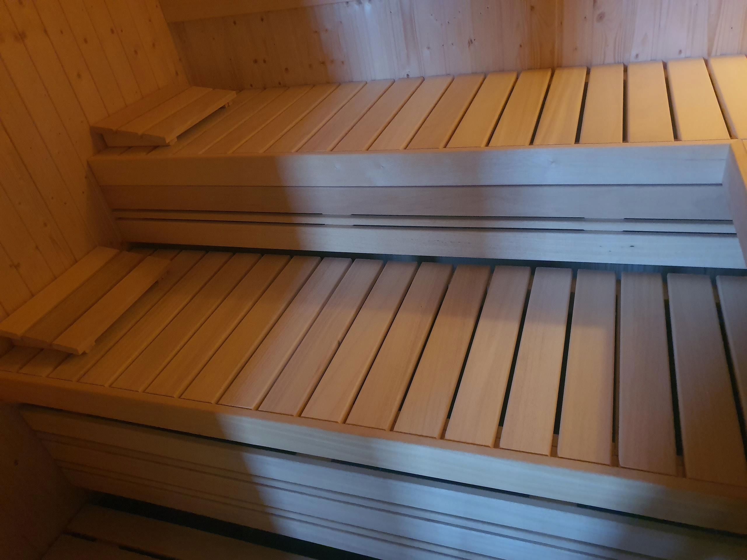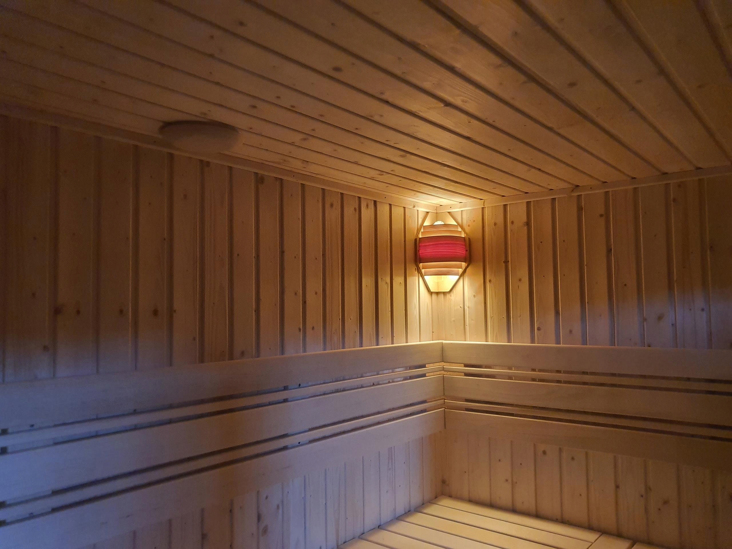Сауна изготовлена из вагонки из скандинавской ели класса А толщиной 14 мм. Стены толщиной 65мм, утеплены минеральной ватой 50мм. Дверь цельностеклянная, без порога, прозрачная. Скамейки, кожух печи, спинки, помост, подголовники изготовлены из ненагревающегося дерева абачи.