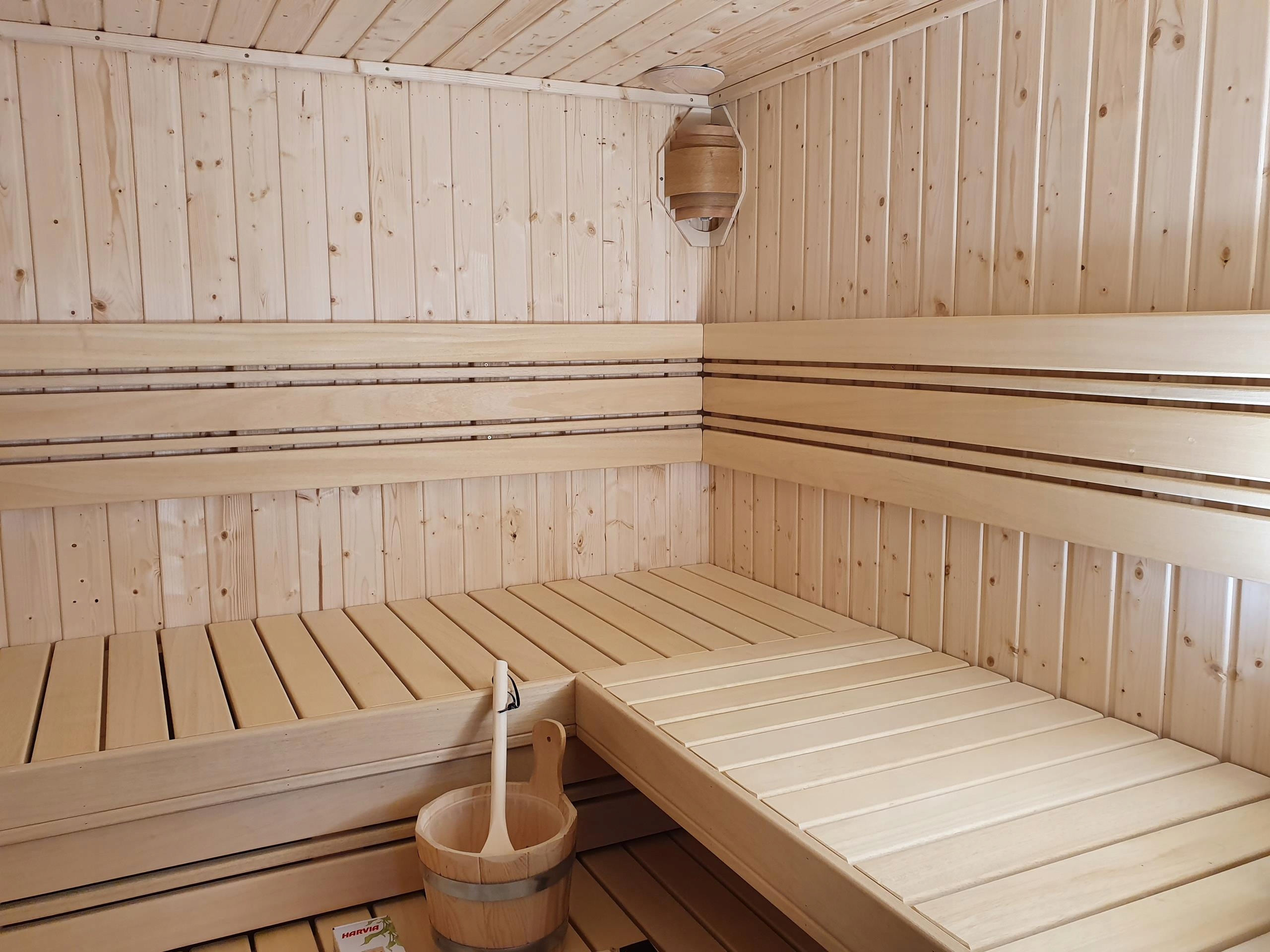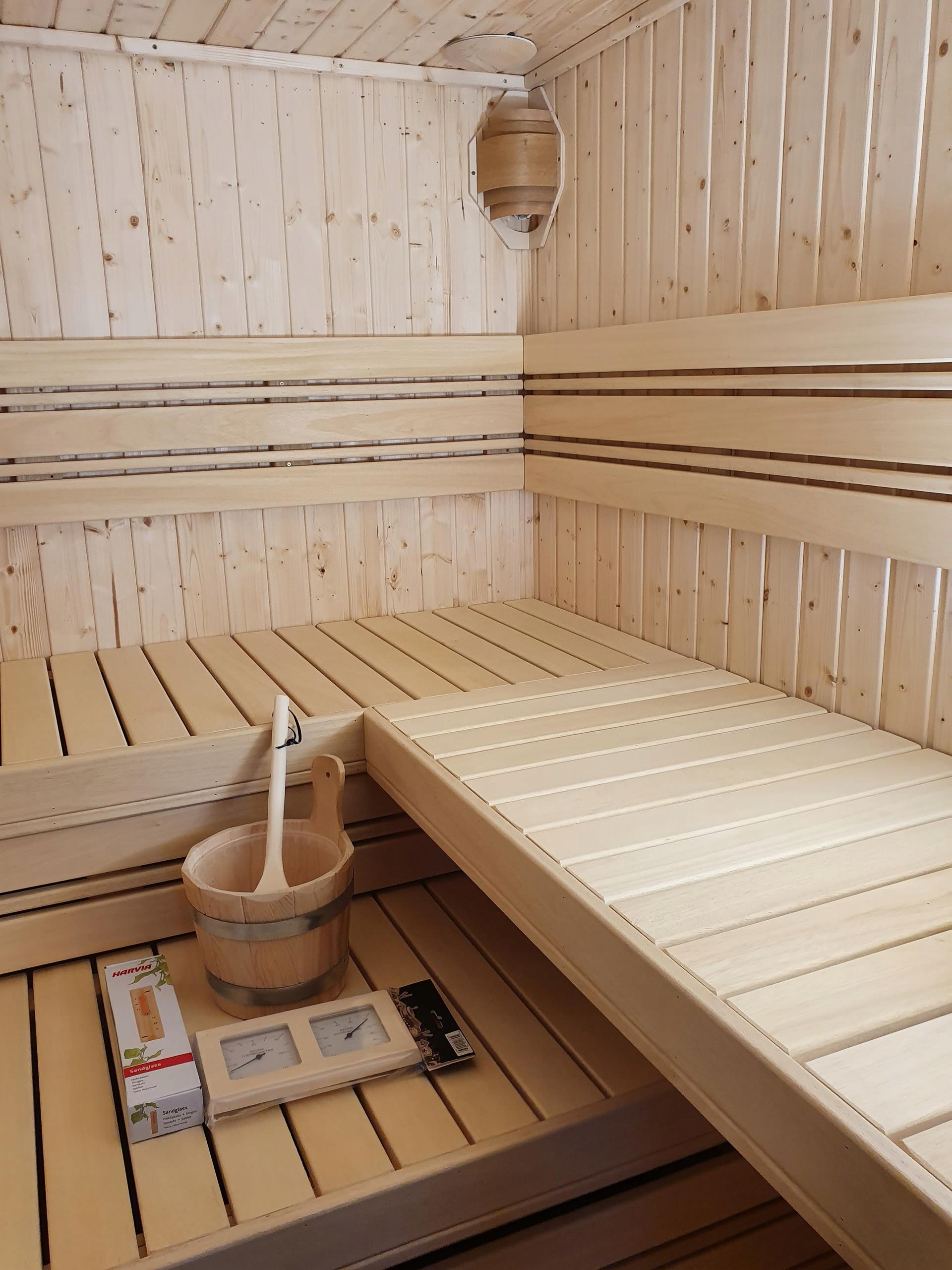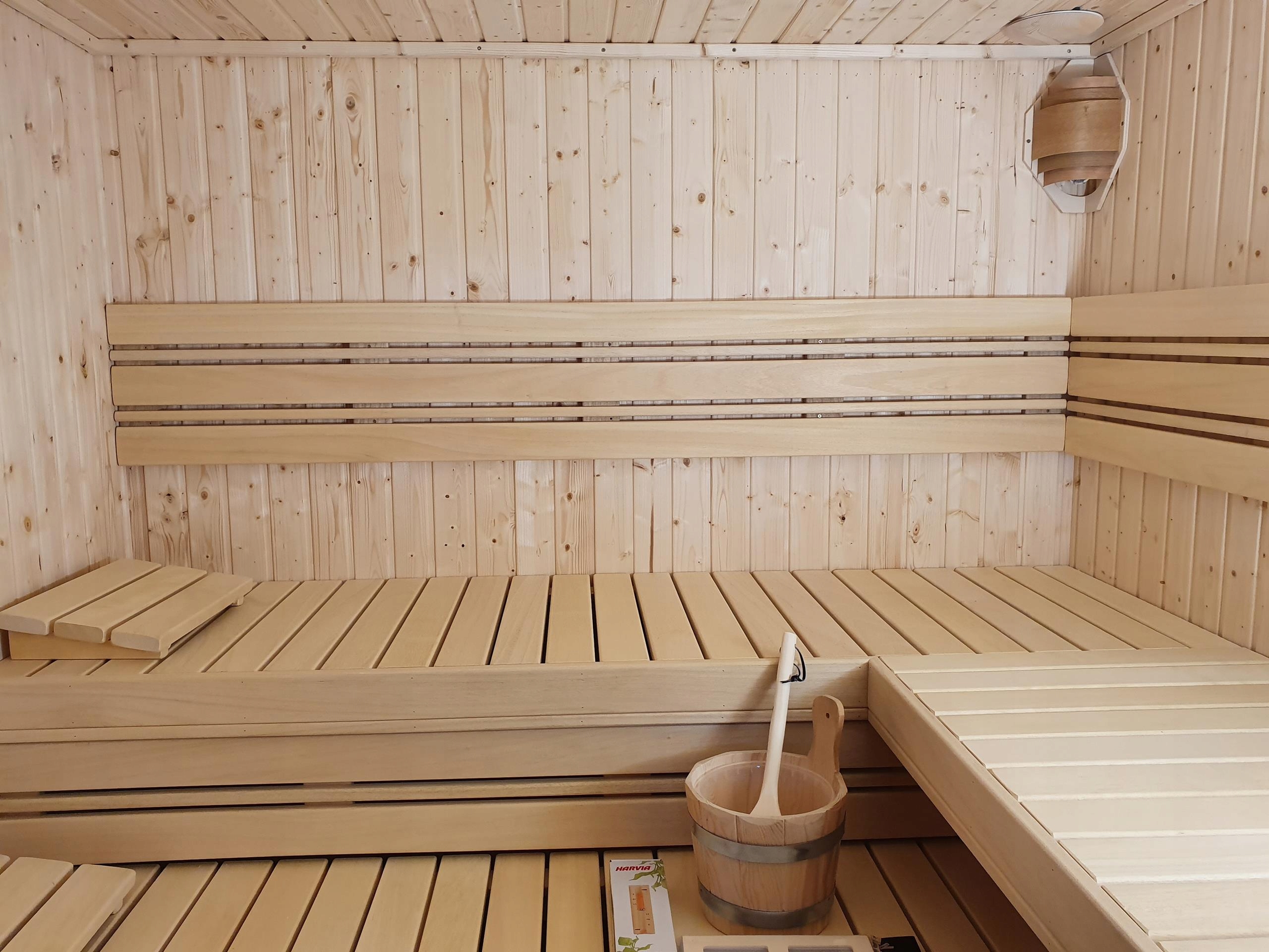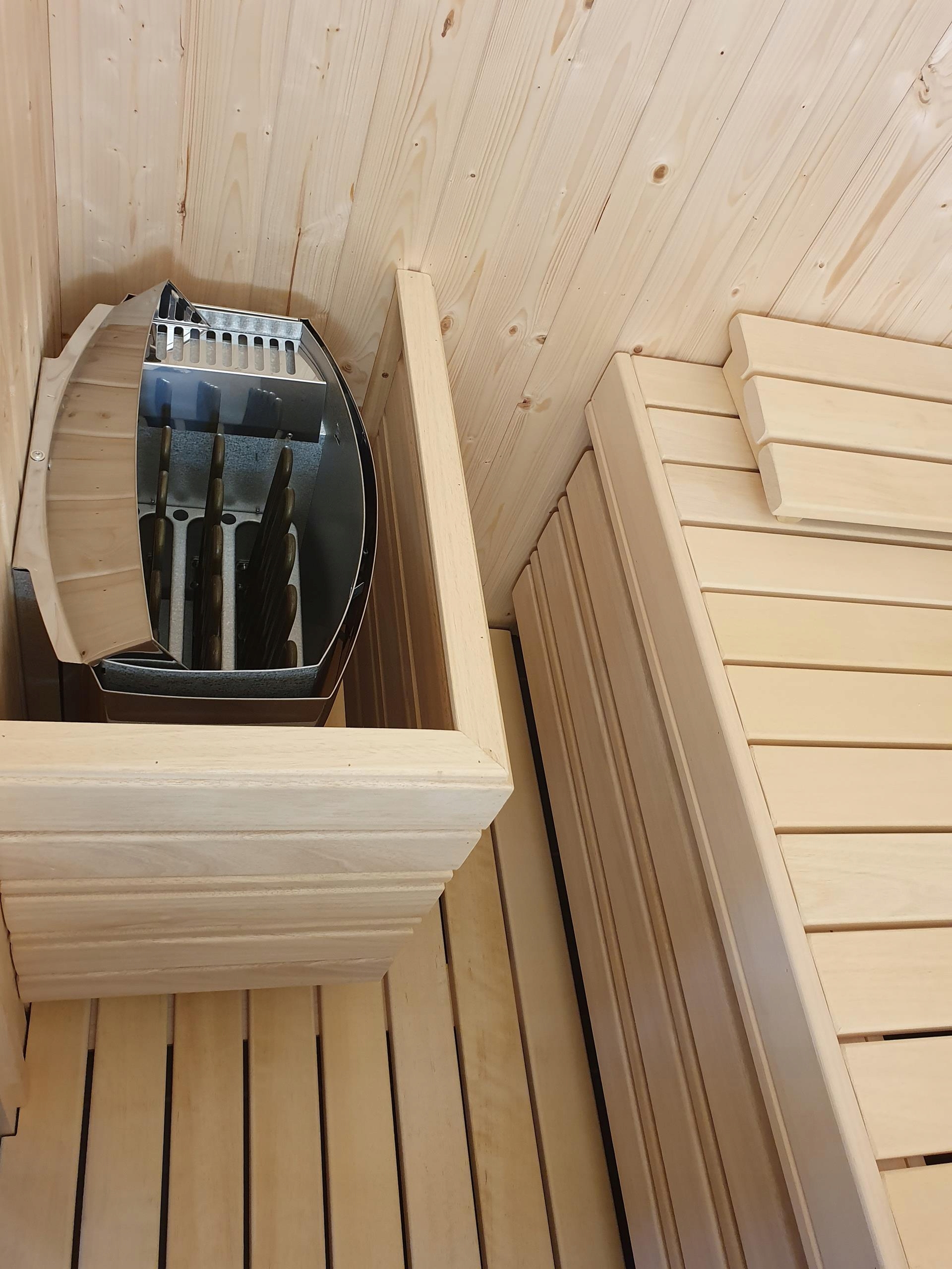 Сауна изготовлена из вагонки из скандинавской ели класса А толщиной 14 мм. Стены толщиной 65мм, утеплены минеральной ватой 50мм. Дверь цельностеклянная, без порога, прозрачная. Скамейки, кожух печи, спинки, помост, подголовники из ненагревающегося дерева абачи.