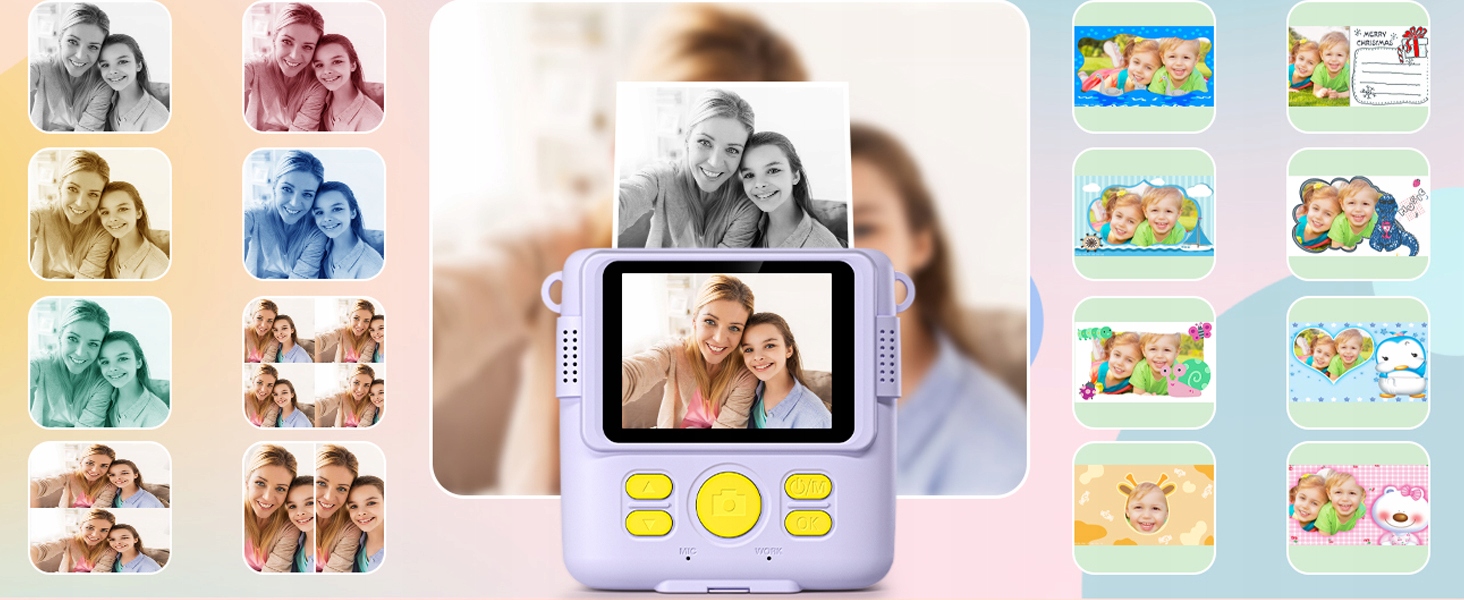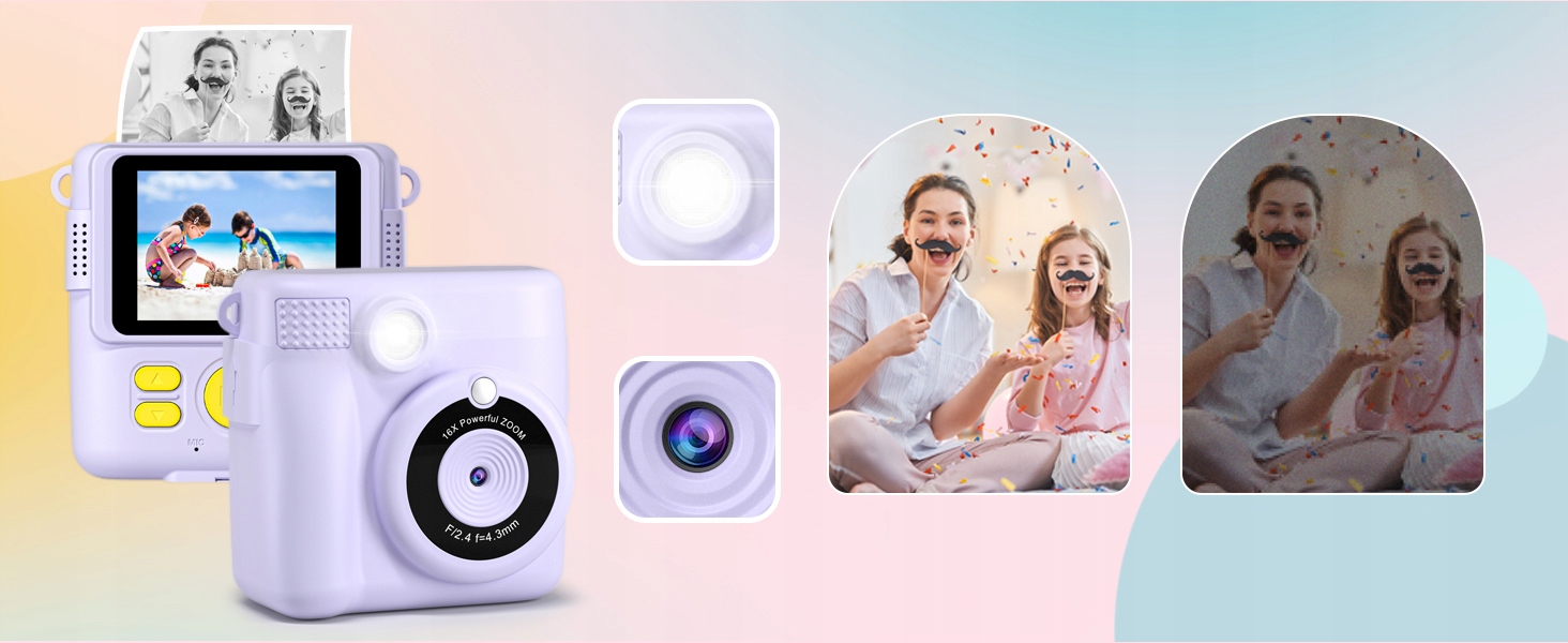 - 📷 Ремешок того же цвета помогает детям брать камеру куда угодно. 6 разноцветных маркеров позволяют детям свободно использовать свое воображение и творчество при распечатке черно-белых фотографий.